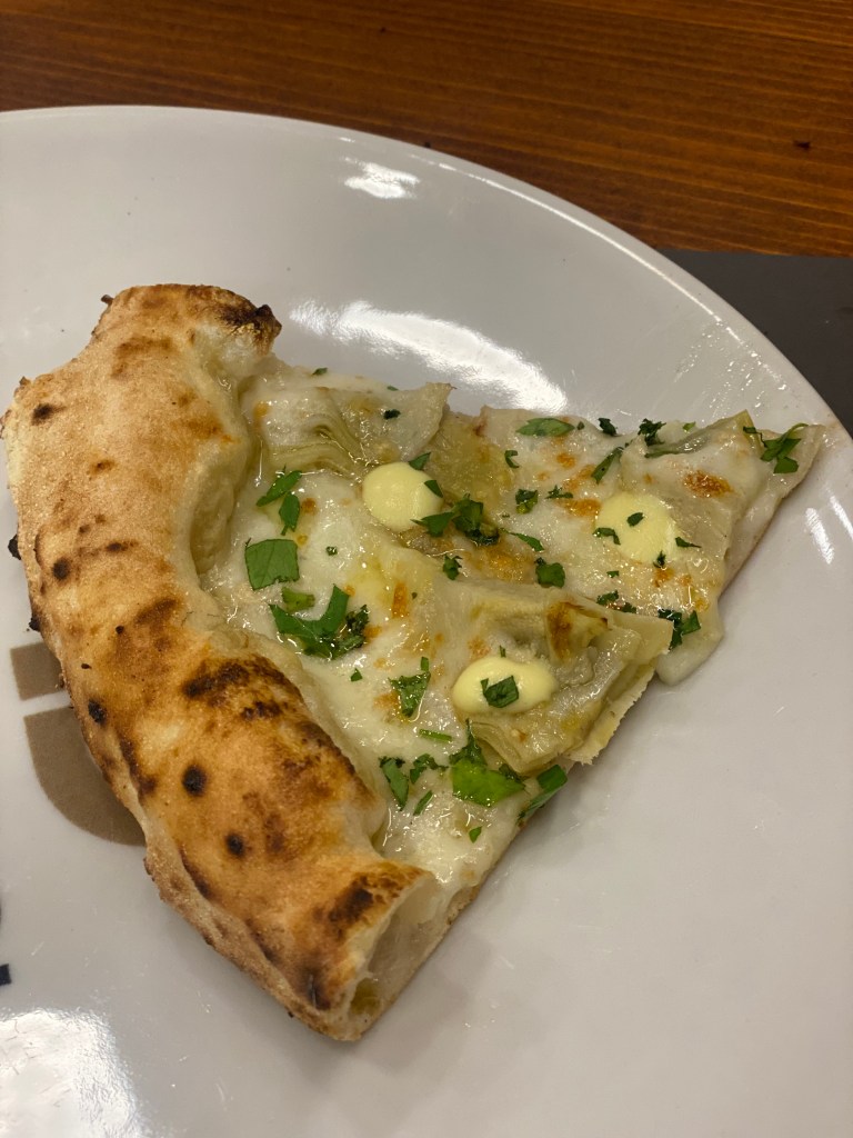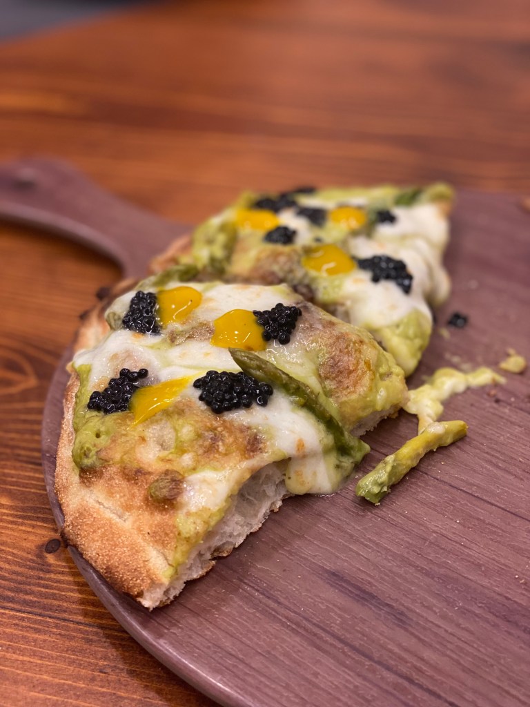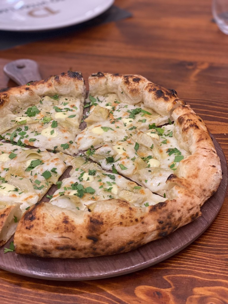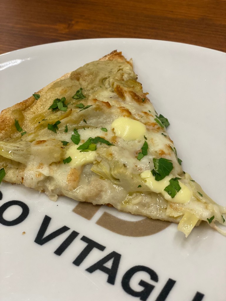 Come un carciofo alla brace (crema di carciofi, spicchi di carciofi, provola di Napoli, crema d’aglio, pecorino, olio al carciofo bruciato), su impasto classico e rustichella. Incastrare l’aromaticità fumè del carbone acceso prima in un abbraccio e poi in uno scrocchio superfigo. Stessa anima per cuori diversi.