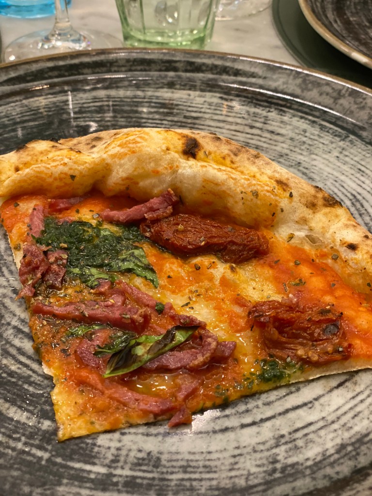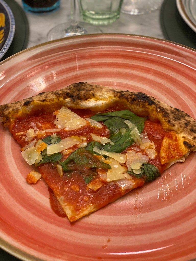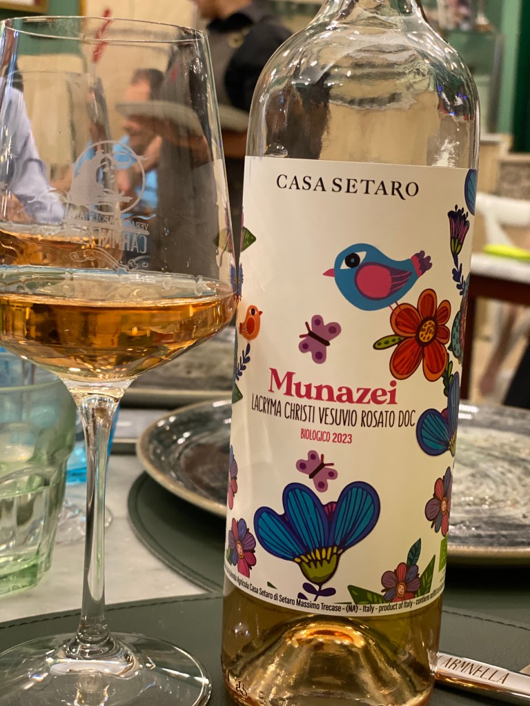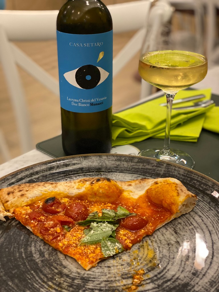 E così sulla maestosità della Marinara Plus (pomodoro lampadina Dama, salame Napoli, pomodorini semi dry, aglio orsino, basilico, olio evo e origano di montagna) l’intreccio di aromaticità, umami e tendenza dolce, da morso lungo e godurioso incontra la freschezza sapida del Lacryma Christi Rosato ‘Munazei’ – Casa Setaro. Splendore indifferente.