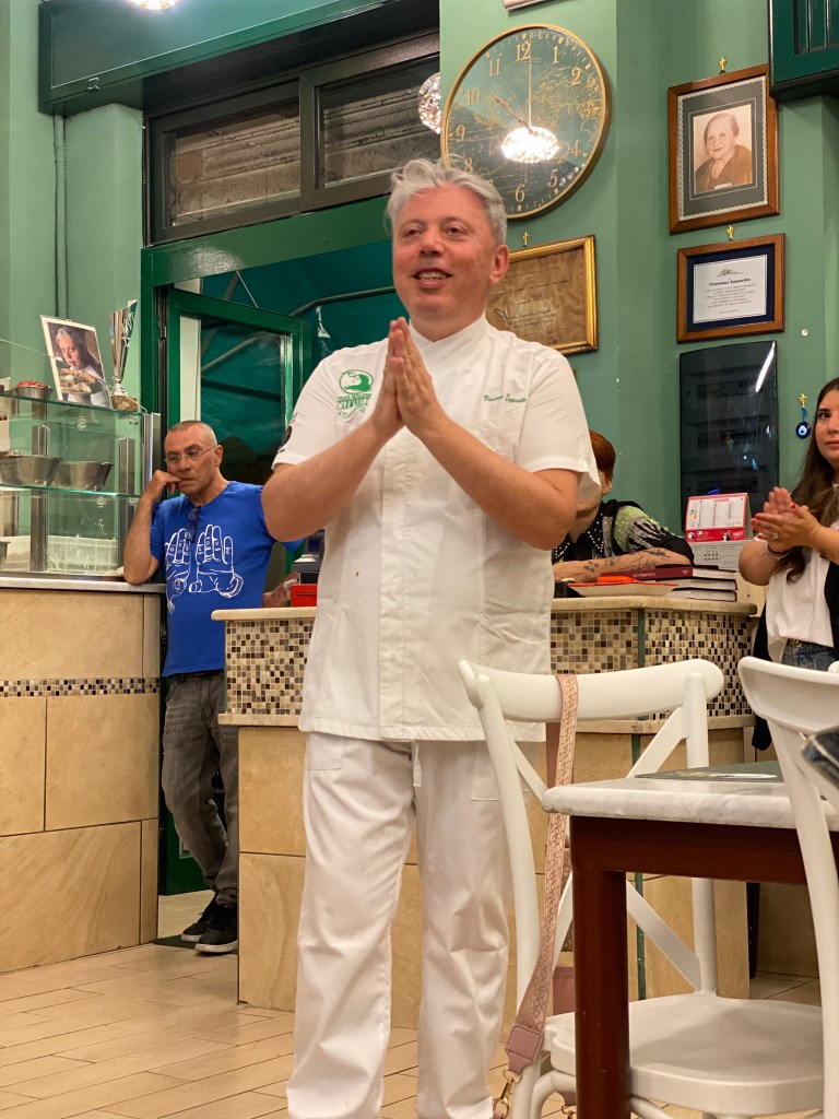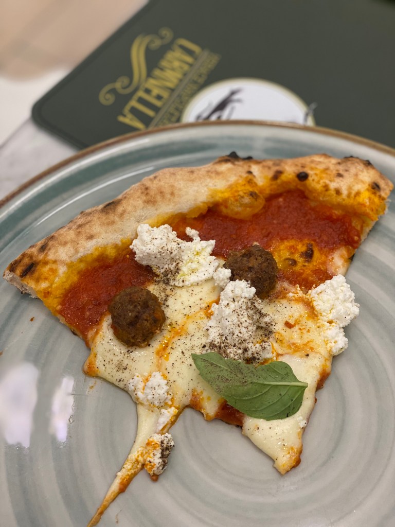 Un devoto saluto al ragù con le polpettine della Elena Ferrante (ragù napoletano di lunga cottura, ricotta di cestino, fiordilatte d’Agerola, polpettine, formaggio, basilico riccio napoletano, pepe di Rimbas), per poi lasciare l’ultimo tassello alla sorpresa del maestro.