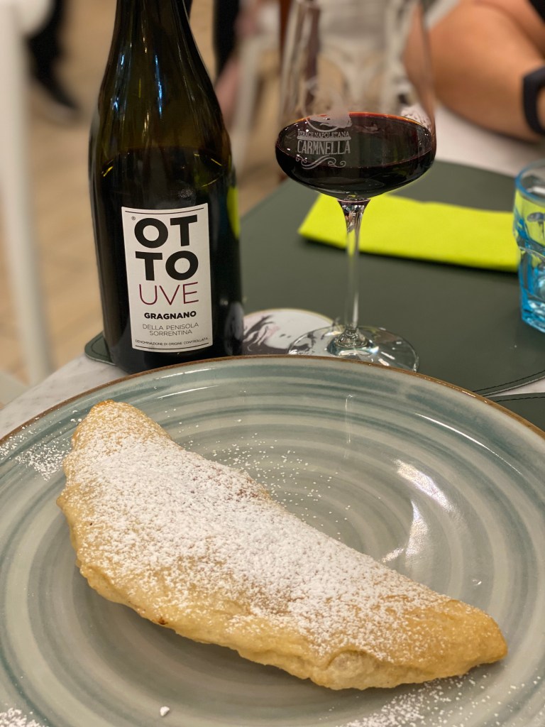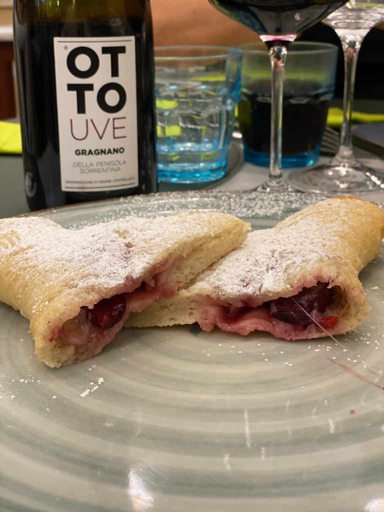 Fritta con provola, pepe e ciliegie. Zucchero a velo e Gragnano Penisola Sorrentina DOC ‘Ottouve’ – Salvatore Martusciello. Sipario. Quando una cosa sembra tante cose allo stesso tempo. Una mezzaluna di domande e pensieri originali. A menù subitissimo!