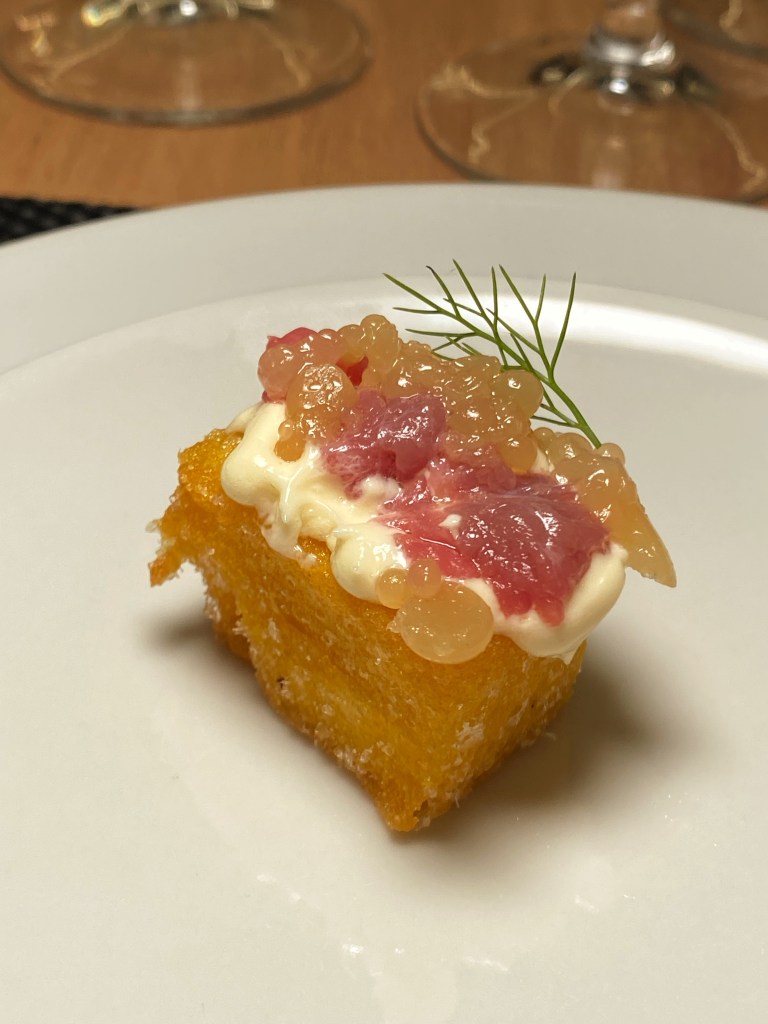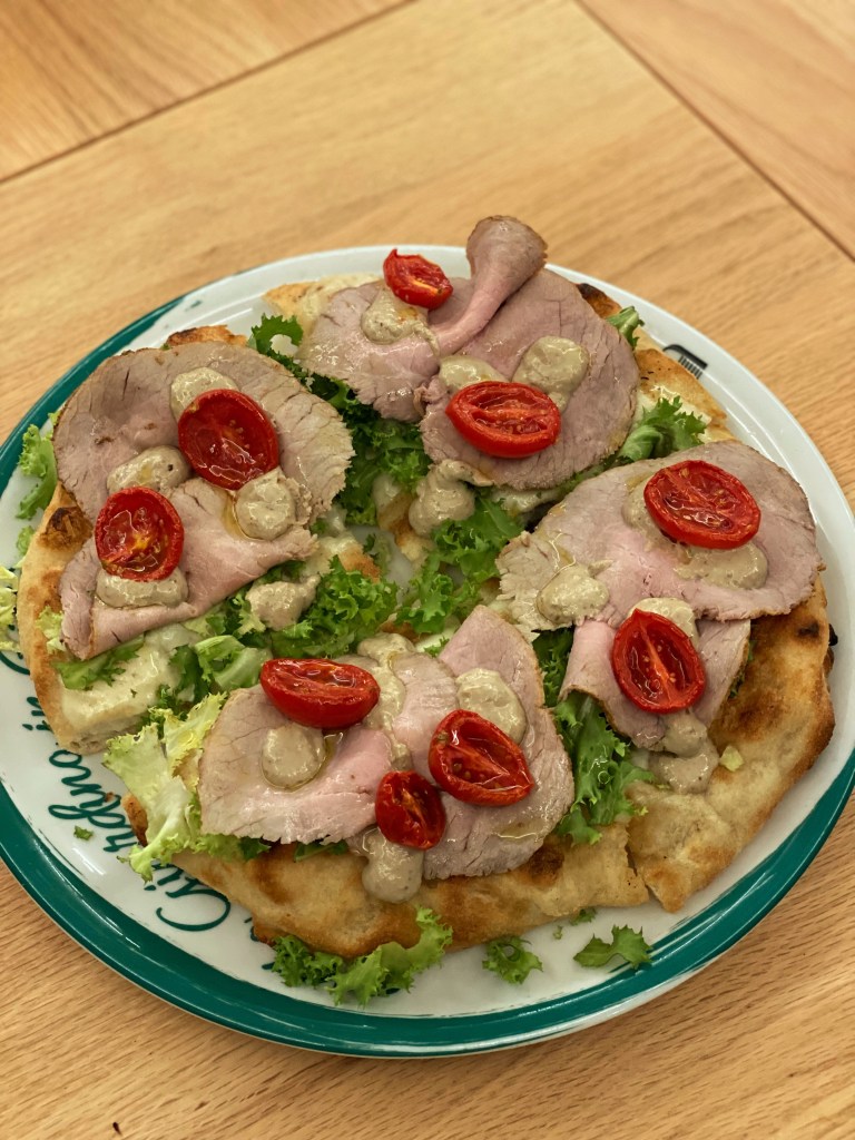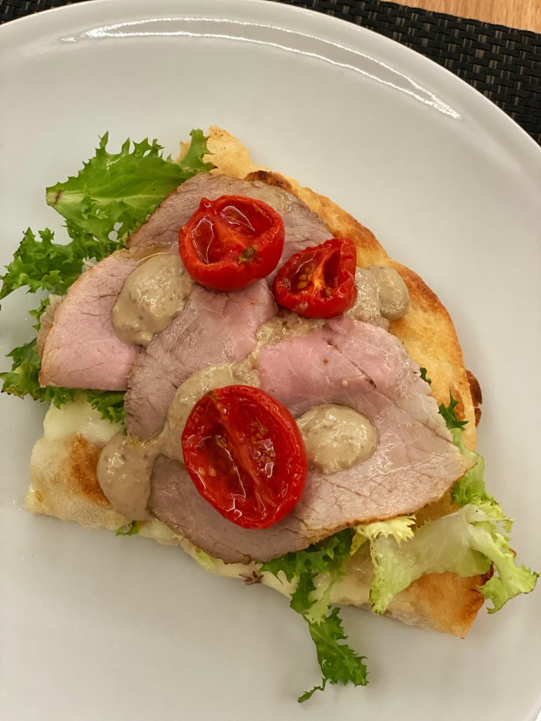 Poi la base Tripla di Simone con superficie multistrato: scarolina riccia, vitello cbt, salsa tapenade (olive, capperi, tonno pinna gialla, mayo), fiordilatte, pomodori piccadilly semidry. Il piacere della lentezza. L’umami. Morso lungo, lento. Poi il crunch. La cremosità. La freschezza. Nome in codice: Vitel Tonnè XXX 3, una insospettabile conversazione tra universi in movimento. (a menu?)