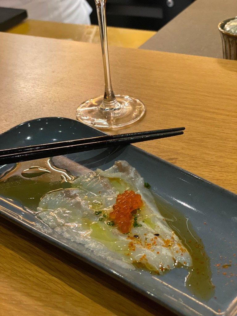 Usuzukuri Hirame, un carpaccio di rombo con erba cipollina, polvere di peperoncino Togarashi e uova di trota salmonata in salsa ponzu (soia e agrumi). Eleganza leggiadra.