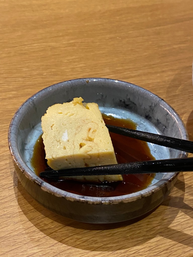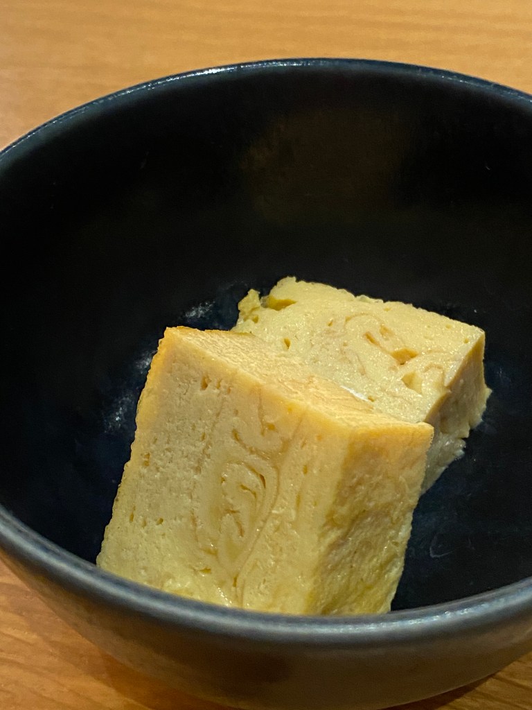 Tamagoyaki, omelette quadrata tipica giapponese con uova, mirin, zucchero, spezie e salsa di soia in brodo dashi fatto con alga kombu e katsuobushi. Come una frittata di maccheroni di Partenope.