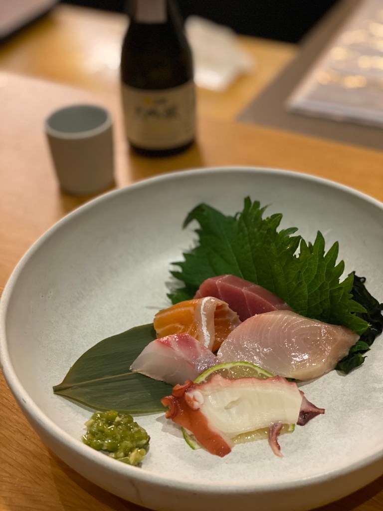Sashimi Moriawase. Tonno, ricciola di Hokkaidō, polpo verace e salmone delle isole Faroe con foglia di wasabi. Air fresh.