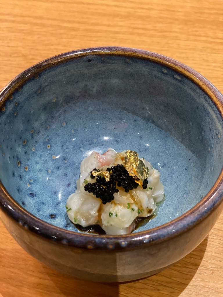 Tartare di scampo affumicato con olio yuzu, zenzero fresco, uova di pesce volante e oro 24 carati. La vanità a servizio della sostanza.