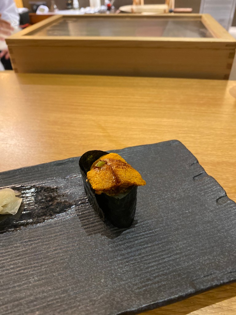 Gunkan Uni (riccio di mare giapponese). Approfondimento: consistenza cremosa, gusto deciso, fortemente marino e carico di umami. Come un carrarmato.