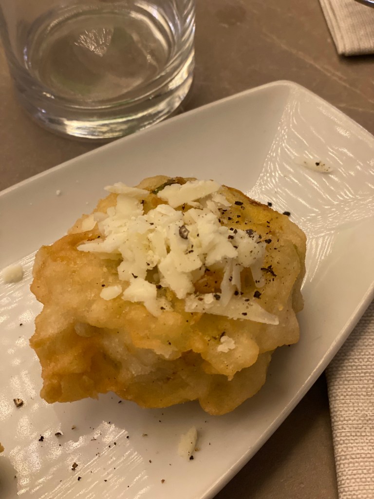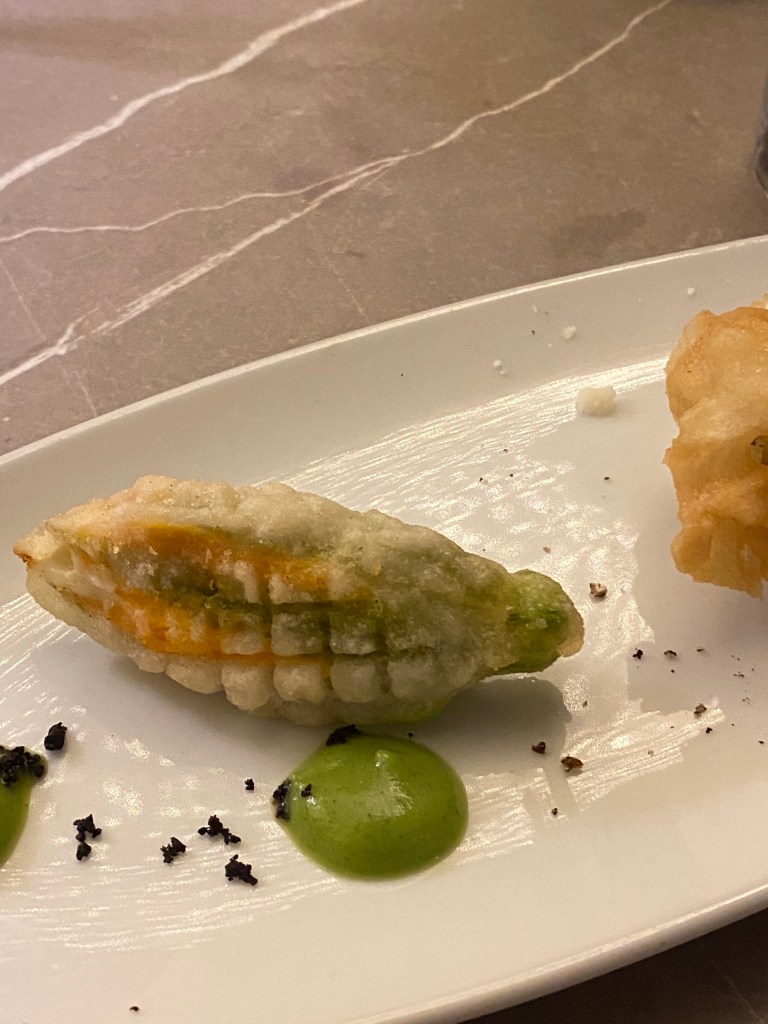 I fritti sono sentimenti primari e genuini. Frittatina vispa. Fiore di zucca, in tempura ripieno di ricotta, romantico. Giusti e intensi, come devono essere.