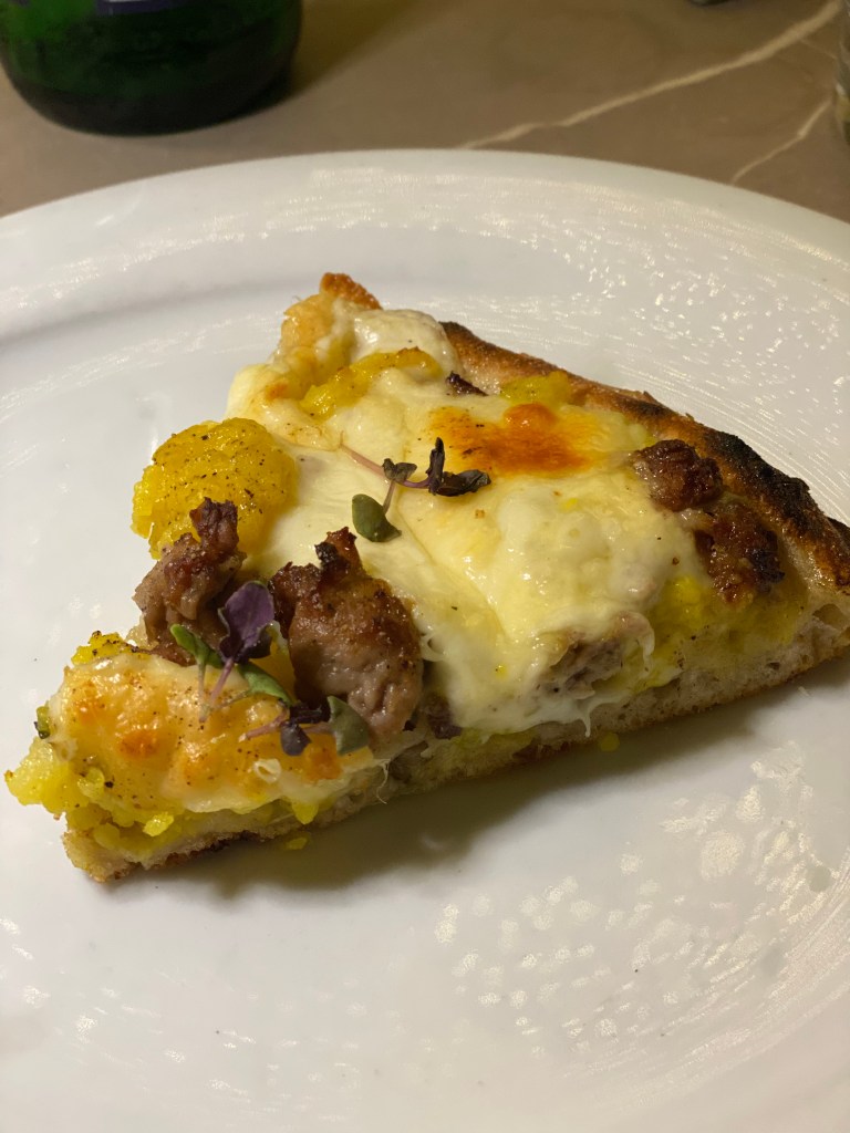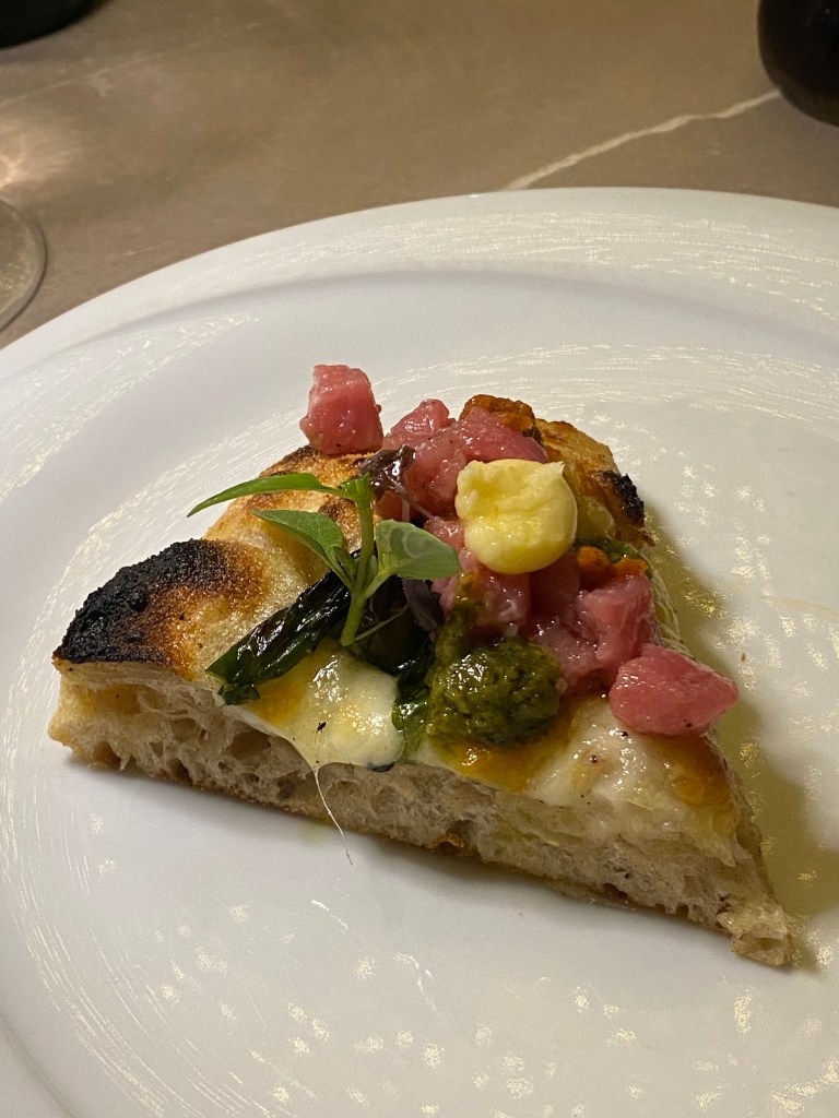 Infine classicismo che sa di neo-classico. La Capricciosa secondo Roberta è l’ennesima lirica. La mia idea di Empireo. Pura eleganza di contenuti ed equilibri magnetici. Al salame fa compagnia la pancetta di maialino Nero Casertano affinata al miele, olive caiazzane in doppia consistenza, carciofini alla brace che donano fumé e porcini trifolati che giocano di consistenza e annaffiano con umami liquido. Scegliere un bouquet di complimenti.