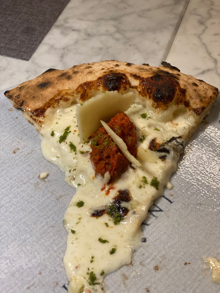 Ritrovata nel ruoto. Impronta, rituale antico, ricordo, eredità. Sapore patrimonio dell’umanità. Consistenza atavica, profumo che riacciuffa la caratura del tempo, affresco edibile nella sua foggia più radiosa. Una pizza con un’anima tangibile, profonda e autentica. Materia, tatto ed eleganza da lodare.