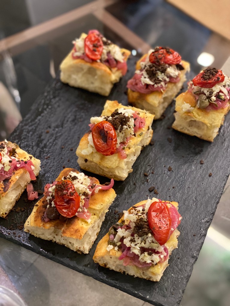 Prima, il benvenuto gioca croccante di focaccia con baccalà alla tropeana.