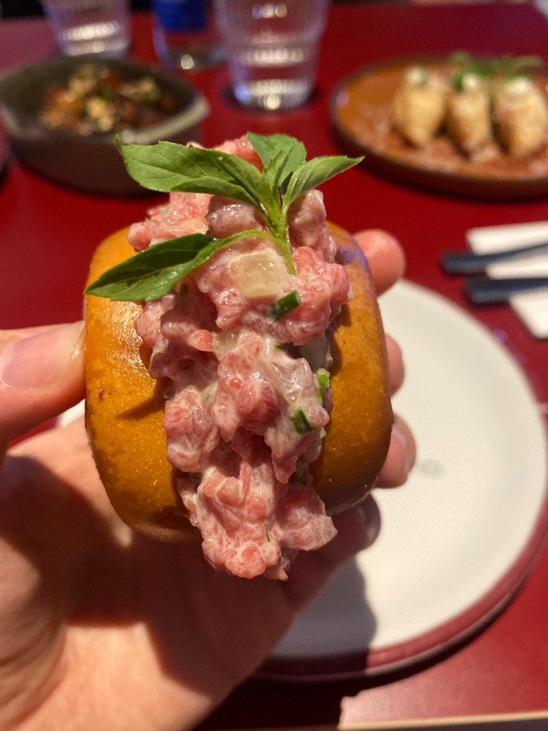 Starter rampante dalle classicheggianti nuances della casa, dove la grazia della panificazione è nel dna. Mantou Bao, Prima cotto al vapore, poi fritto, delicatamente farcito con tartare di Frisona e guarnito con salsa tartara. Un soffio, un’eleganza. L’umami spinto di freschezza che si scioglie in un involucro carismatico. Annegare nel manto dorato dalla morbidezza crunch. Palpito.