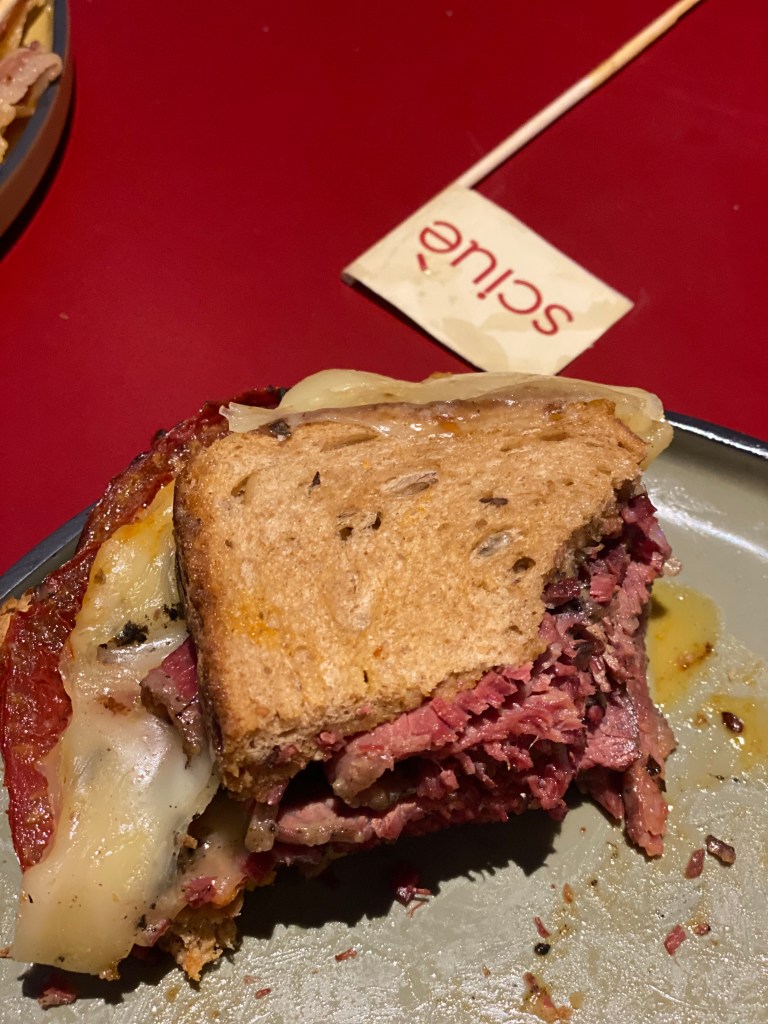 Poi un salto nella Grande Mela per un saluto da Katz. I fratelli De Luca aprono la loro delicatessen campana. Parola d’ordine? Pastrami. Chiuso tra due fette spesse di pane in cassetta multi cereali (psichedelico), strabordante, si affaccia quell’arrosto di manzo dal tipico colore rosato. Tenero come il burro, sapido, succulente e aromatico, in compagnia del caciocavallo, del pomodoro arrosto e della maionese alla senape e miele. Sapore e texture pantagruelici.