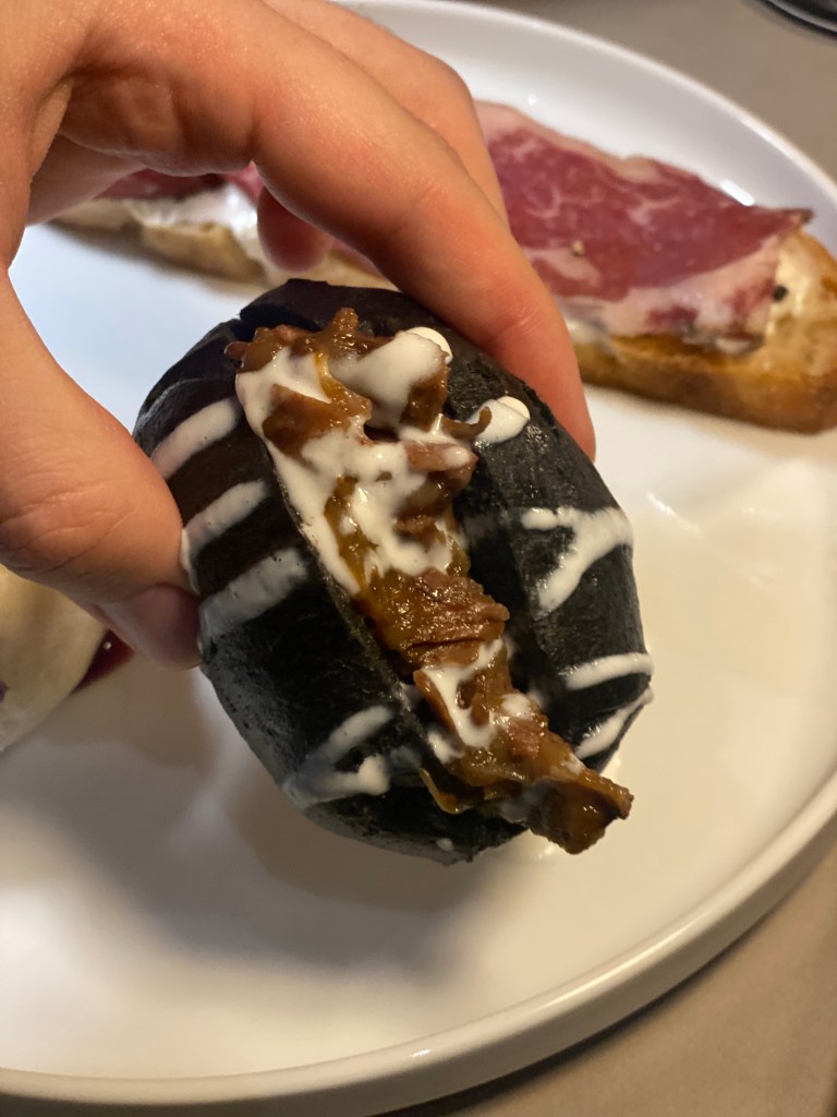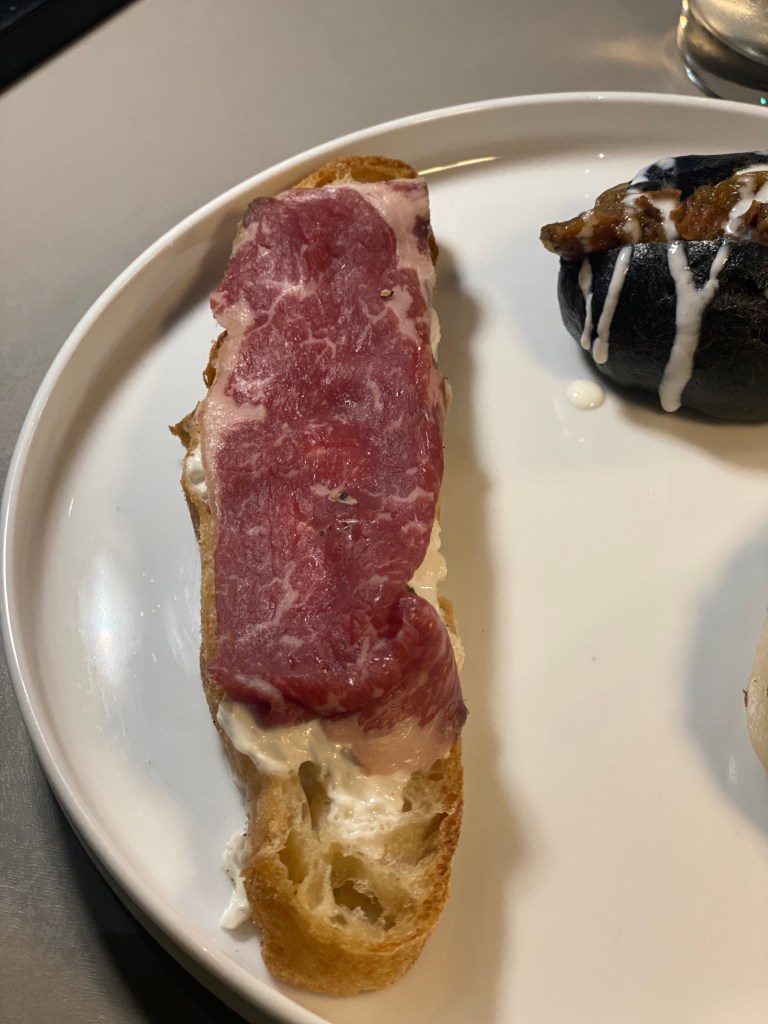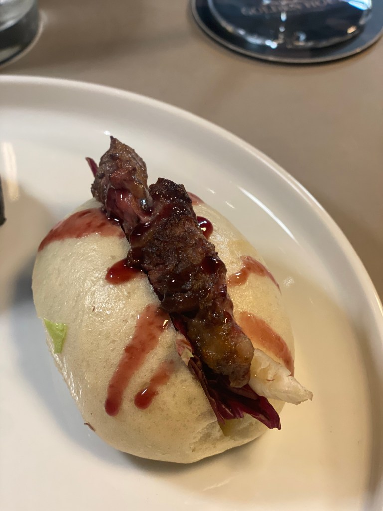 Poi trittico. Trancio di pala romana trapunto di picanha salada di Giovenca Sannita e nuvole di stracciata di bufala. Morbidezza e ricchezza. Poi i gemelli diversi, bao mood, e mo’ black e mo’ white. Il primo al carbone vegetale intriso di Genovese di Giovenca Sannita con salsa di provola. Sofficità devota. Il secondo con Giovenca Sannita, misticanza e riduzione di aglianico. Ancora sofficità e sapore.