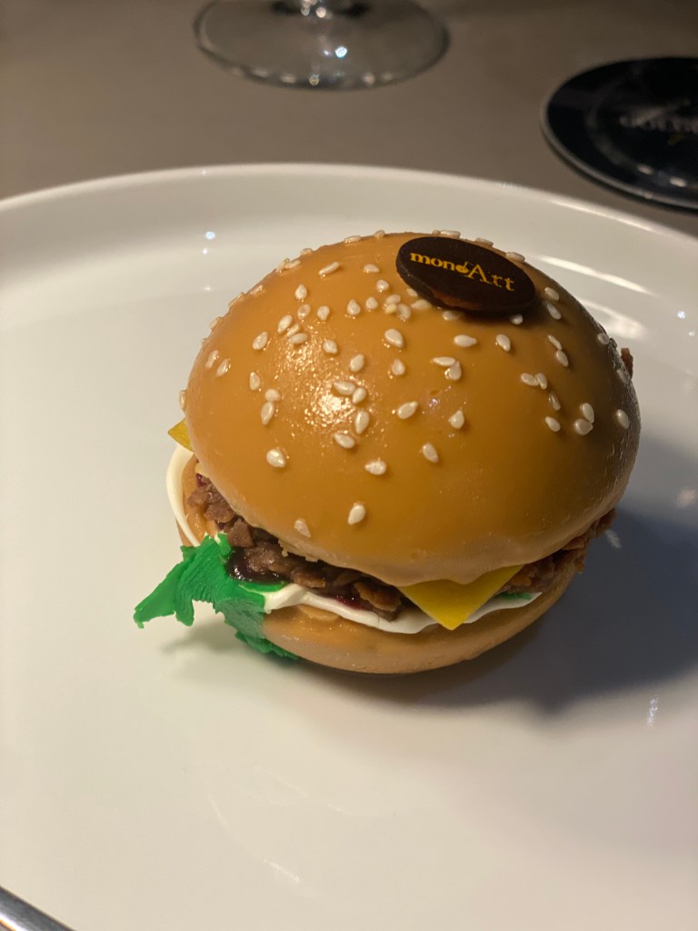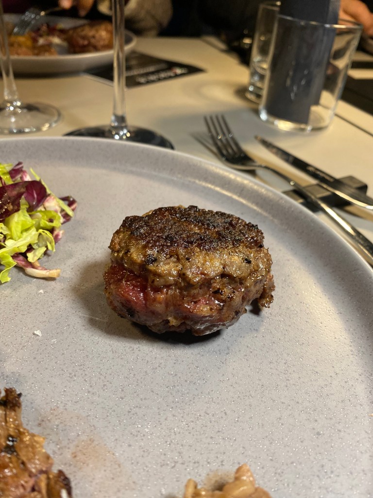 Eppure, il diadema del piatto che favilla è la sorpresa Gourmotto. Hamburger vivo di un blend di otto (principali) tagli di carne bovina con una certa dose di grasso buono. Memorabile: colore superbo, tessitura e compattezza fini, tenerezza al morso, succosità persistente, flavour magnetico e masticabilità fluida. Il ricordo!