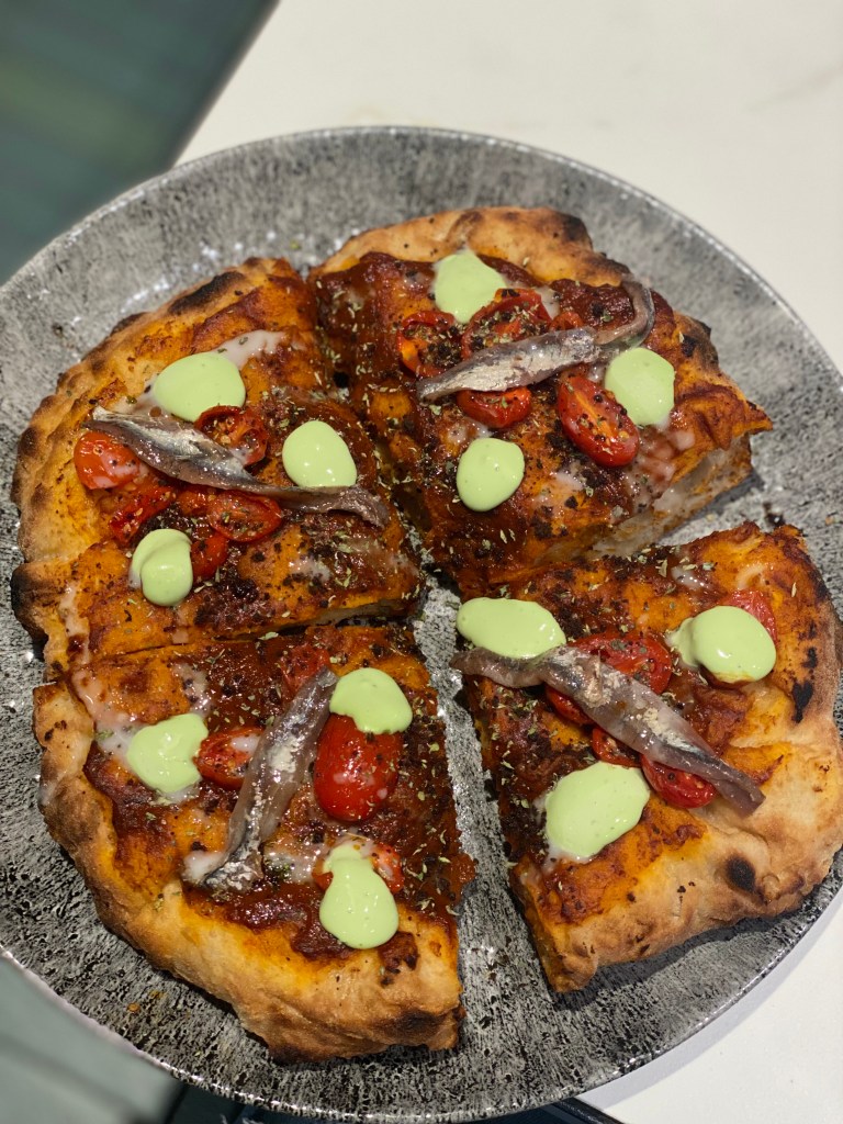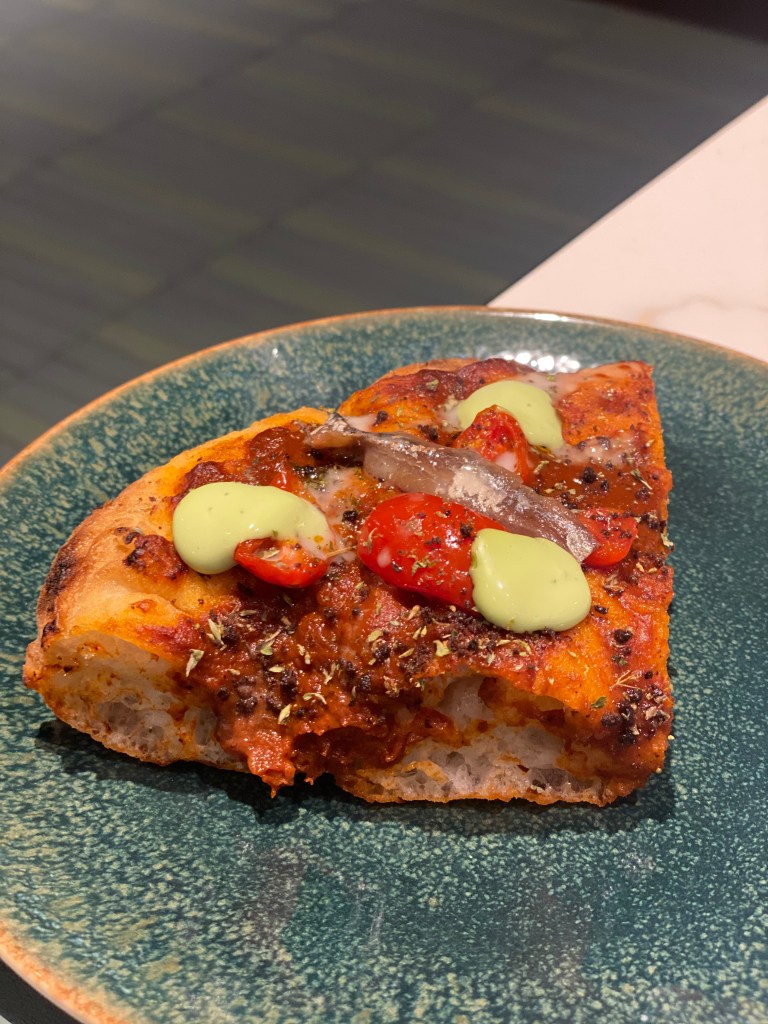 Poi la poetica di una fritta al forno fluffy, dry, golden. Topping di Marinara supersonica (datterino di collina cotto a legna, pomodorini confit, polvere di olive nere, origano, alici di Cetara) che principia dai sentimenti. Porta Nolana con le sue beautifulerie trendy: cremosità della maionese alle erbe, umami della salsa all’aglio, aromaticità del latte di cocco. Rincuorante.