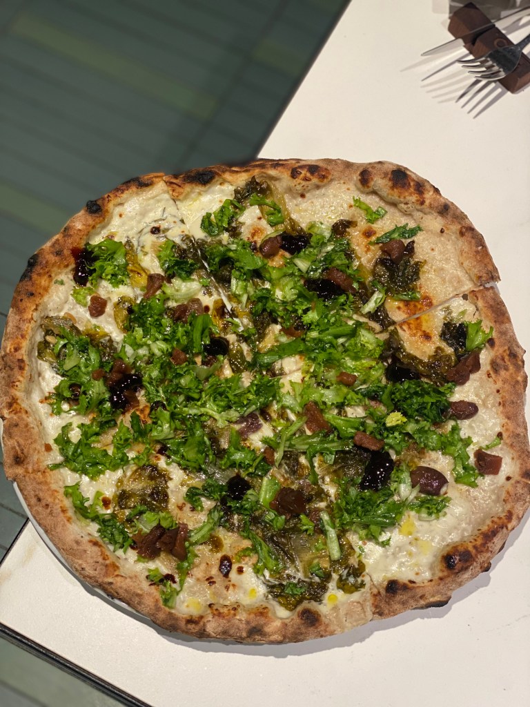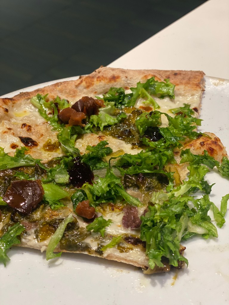 Ma accade anche che ti scontri con il Realismo puro. E le metriche hanno le espressioni di Eduardo. No, non solo per la Natale in Casa Bro, dove gli intrecci sono intrisi del periodo in cui “mi piace o’ presepio!”. Ultra scarole (in padella e marinata), la sapidità della crema di pecorino e la spinta dolce acida della mela annurca ossidata. E poi la gioia del caramello dell’acqua di fermentazione (e dell’impasto di grano, segale e mais). Bravo_bravo! cit.