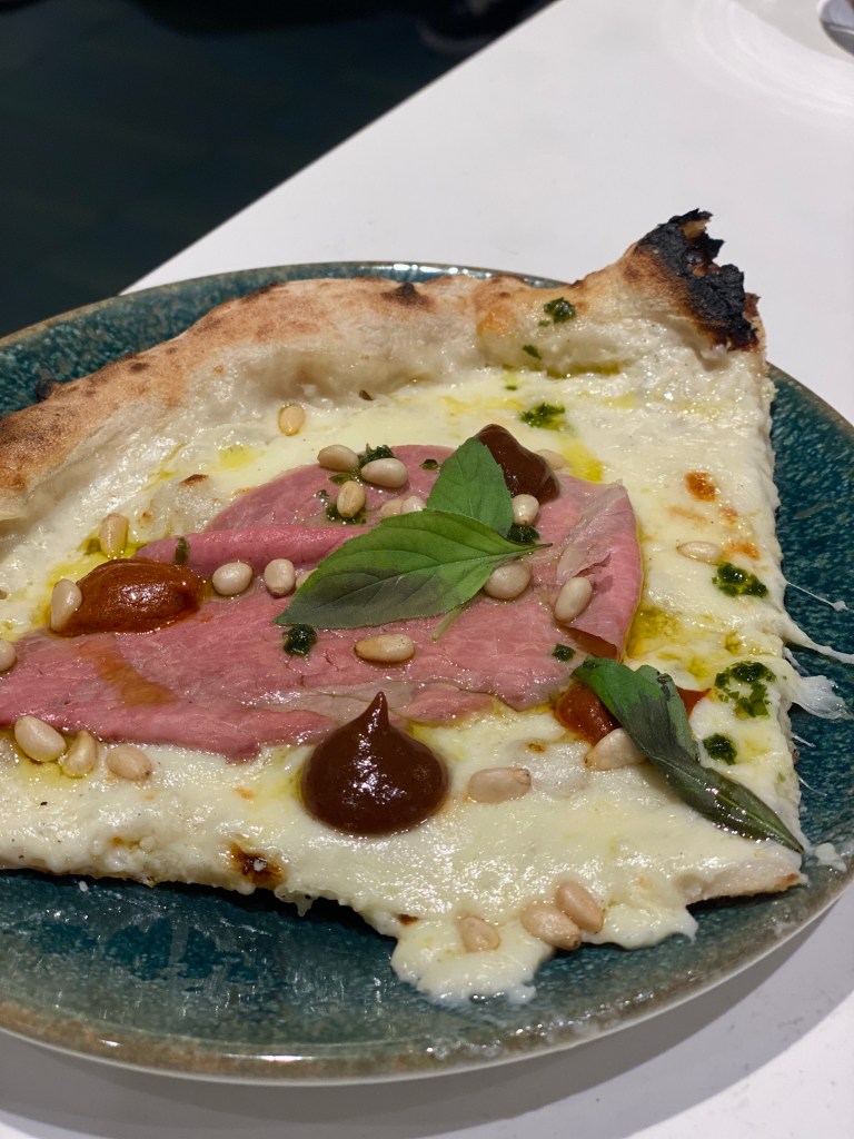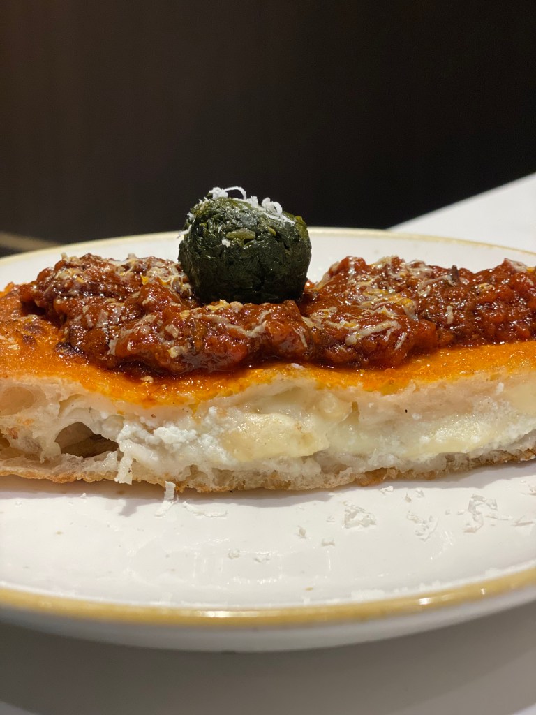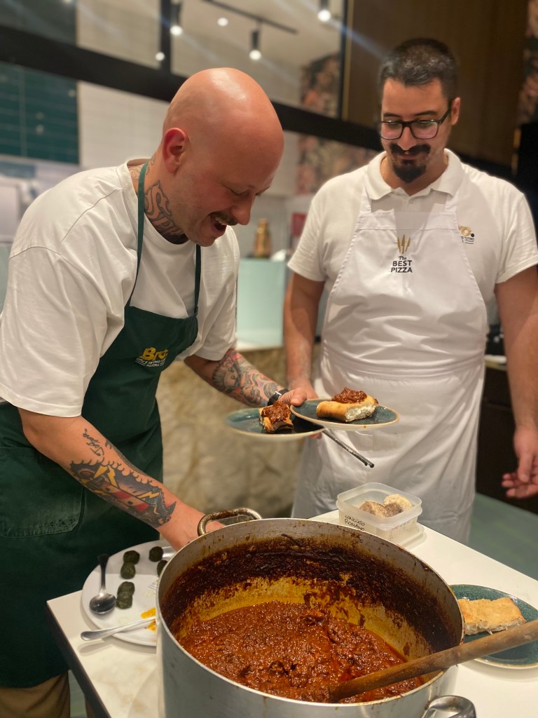 De Filippo celia dal pentolone di ragù firmato chef Ivan De Benedictis (che manico!). Somiglianze di cuore, sembra di stare sul balcone dirimpetto, quando Ivan racconta il perché e il percome. Vivere Sabato, Domenica e Lunedi. Otto ore più otto ore più riposo. No, non è “carne c’ ‘a pummarola”. Un concentrato 1000x di amore, giubilo, di ciò che siamo. Crema spalmabile per un Mas/calzone con ricotta e fiordilatte, sfera di friarielli e conciato romano. Ho visto Partenope.