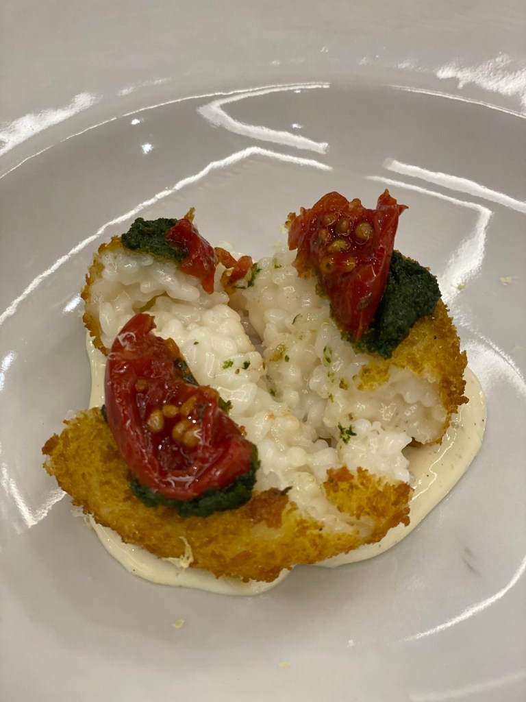 Il palato si diverte fin da subito con l’Arancino di Sorrento, dorato, croccante trionfante di riso Acquerello e zest di limone.