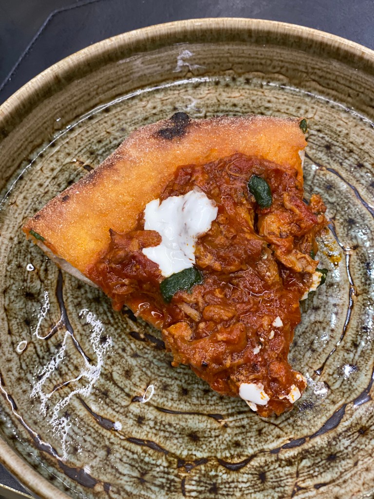 Dorata e precisa la Mia Montanara. Frittura e asciugatura al forno impeccabili. La superficie di bellezza disarmante con ragù di datterino liternese, stracotto di suino nero casertano, crema di latte di bufala e riduzione di basilico. La mia prefe per tecnica e piacioneria.