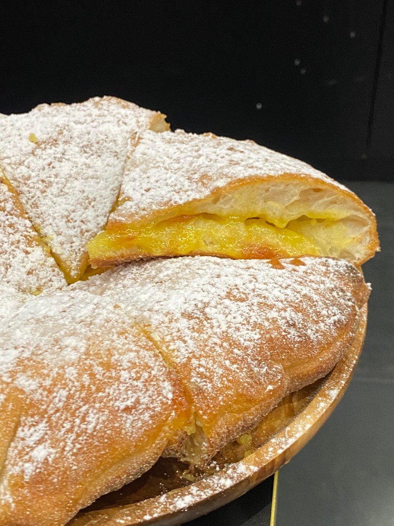 Il fine pasto è un omaggio al territorio con la Pizza Polacca in doppia cottura. Cuore scioglievole di crema pasticciera al profumo di lime e confettura di mela annurca e cannella de Le Ghiottonerie di Casa Lorena di Casal di Principe, un progetto della cooperativa sociale E.V.A. che sostiene le donne e i bambini vittime di violenza.