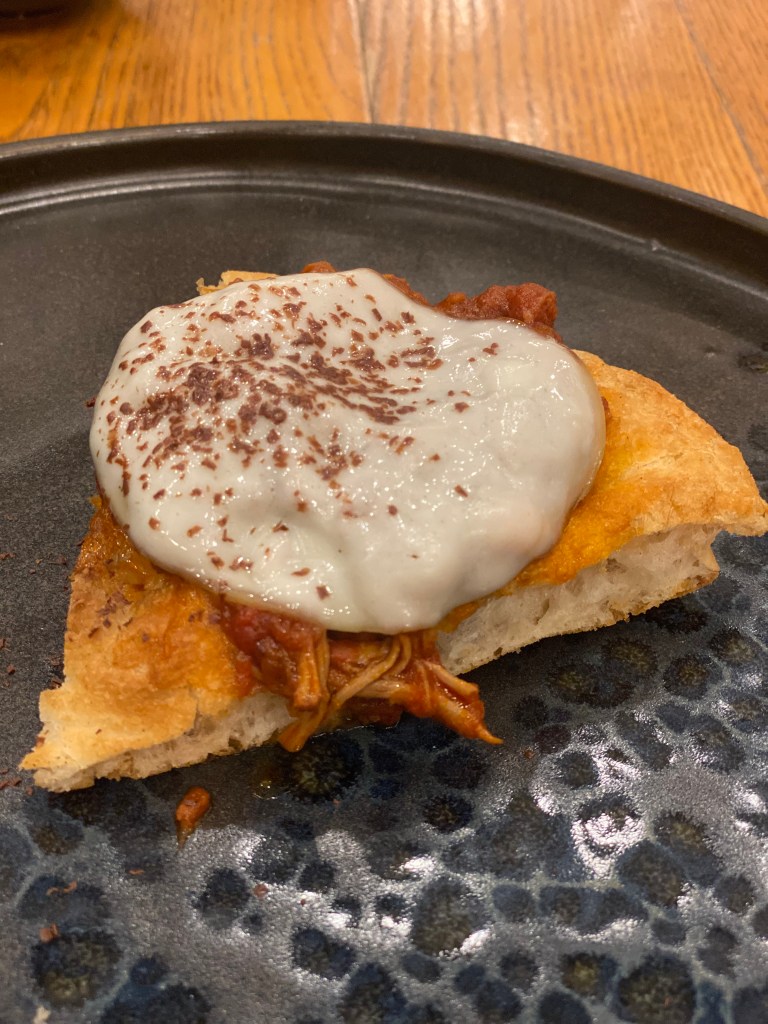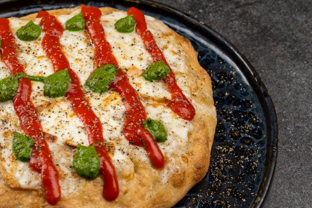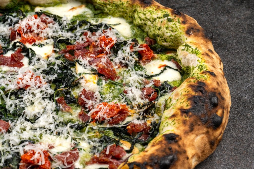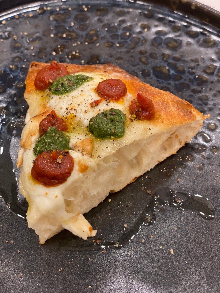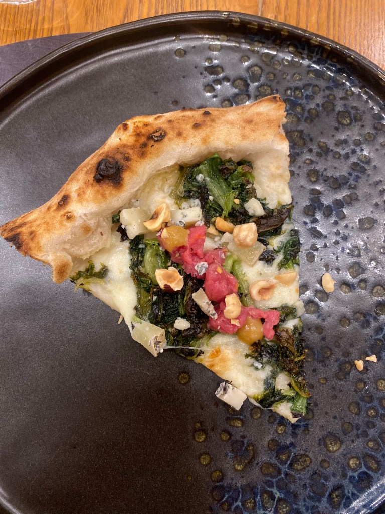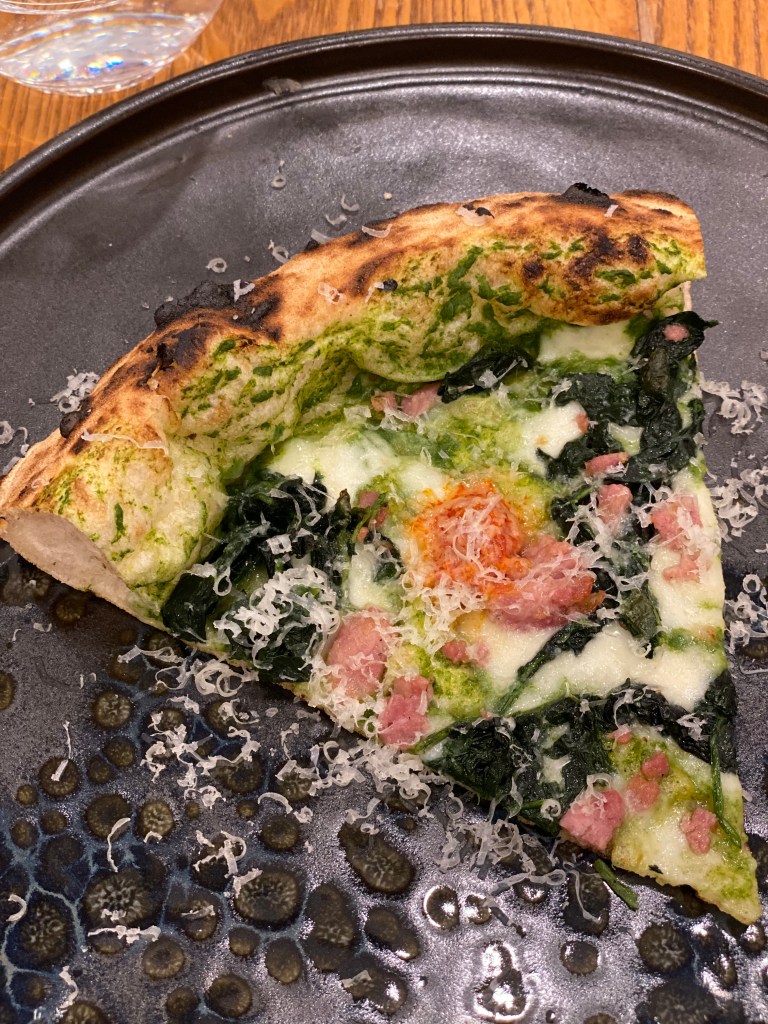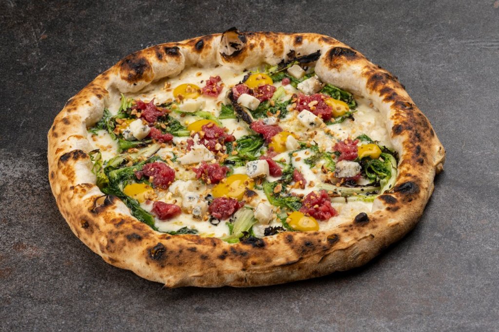 Ngazzate Nire, con impasto signature (prefermento con farina 0 con germe di grano, un’idratazione al 75% e circa 24/30 ore di maturazione) dove i colori giocano con il Broccolo Spigherello. Poco amaro ma intenso, adorna la sua consistenza con le morbidezze della salsiccia pezzente, lo zing della ‘nduja calabra e del pecorino bagnolese. Esuberanza.
