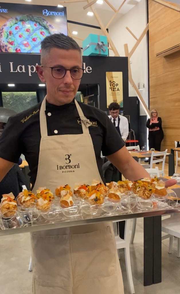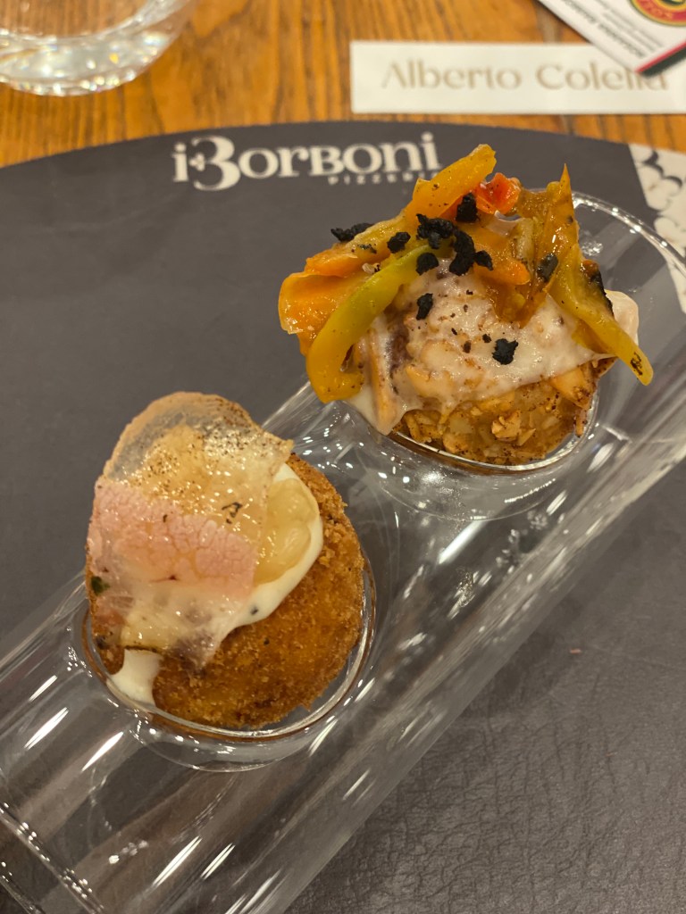 Preciso equilibrio l’Arancino d’inverno Cacio e pepe, un cubo di riso ai tre caci e pepe servito con salsa al cacio con pere e guanciale croccante. Aria natalizia per il Mussill e’ Zuccher, polpetta di baccalà mantecato al latte con mandorle, provola fusa, papaccella napoletana e terriccio di olive nere.