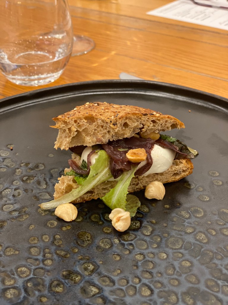 Heatness, croccante e fragrante. Impasto multi-cereali con aggiunta di soia (proteine vegetali). Un sandwich, che qui definisco proteico, farcito con robiola, misticanza, granella di nocciola IGP, zest di agrumi, cipolla rossa caramellata, olive taggiasche. Salubrità palatale.