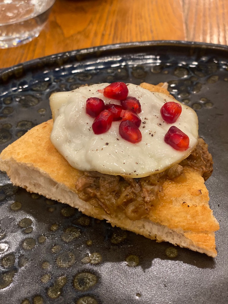 Monzù, double crock (idratazione all’85%), fritta e al forno per gli amici, Genovese mood. Provola, polvere amara di caffè e gradienti freschi acidi di melagrana. Raù, stessa predisposizione d’animo. Crema spalmabile partenopea e cioccolato. Oro e diamanti.