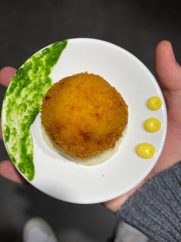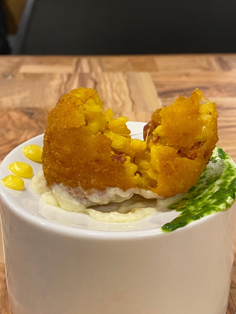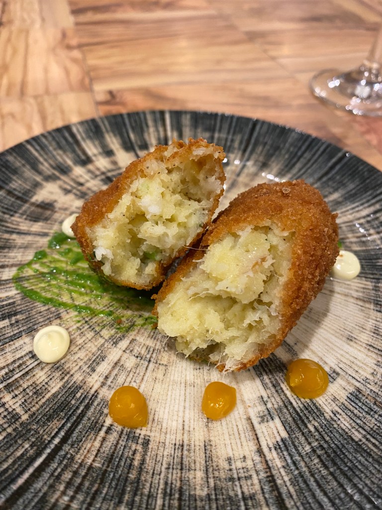 Crocchè di patate di Avezzano con baccalà servito con maionese al limone e gel di frutta esotica, un soffio di umami marino. Concetti omogenei, dorati e non convenzionali.