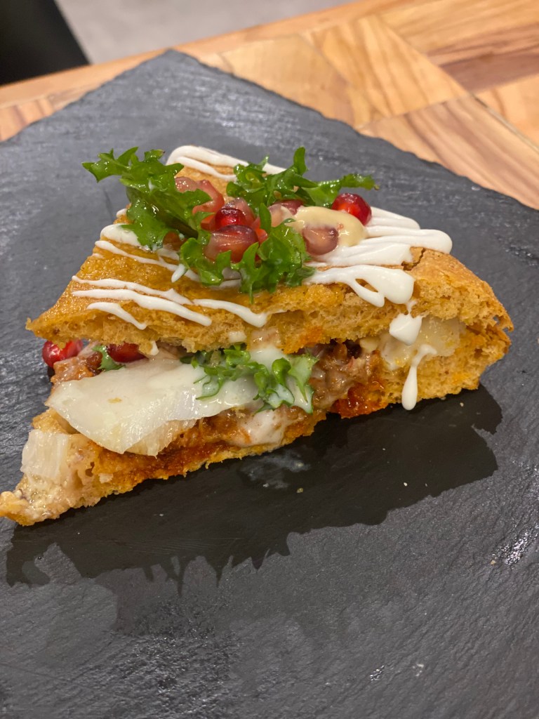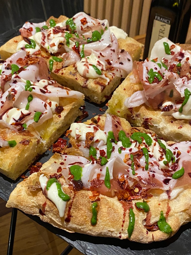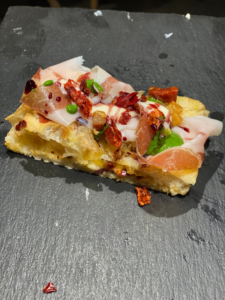 La pizza in pala si sposta in Lucania dove il Viaggio prevede cremosità piccante di fonduta di canestrato di Moliterno, grazia di lonzarda di maiale, intensità di riduzione di aglianico del Vulture, brio di peperone crusco. Consistenze e variazioni su twist continuo di elogio alla materia.