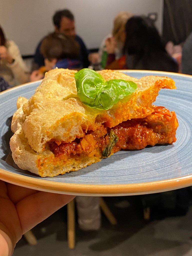 Giuoco costante col crunch di soffritto napoletano nobile. Un sandwich ricco e piacione dove i morsi si susseguono vivaci. Balocco.