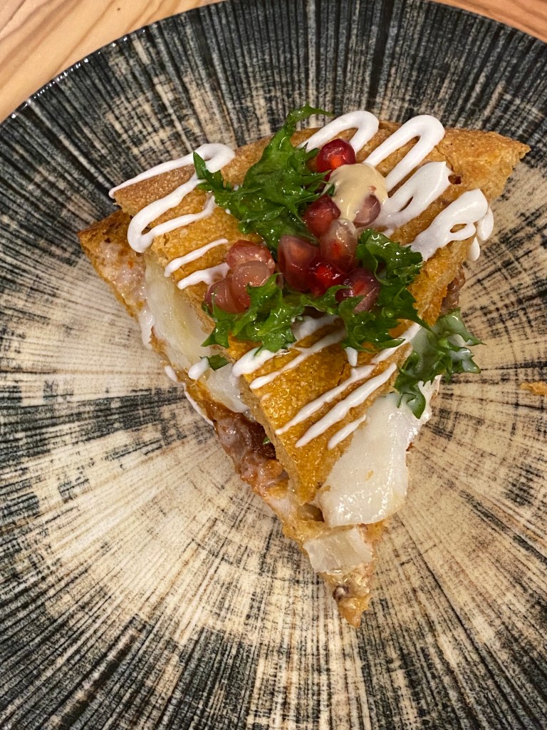 L’impasto del padellino, infine, accende la vibrazione. ‘Nduja inside, innamorato perso. Superficie e cuore spengono i bollenti spiriti con la tendenza dolce del baccalà in oliocottura aromatizzato al rosmarino, la giocosità fresca della scarola riccia croccante, l’acidità della melagrana. Salsa di mozzarella e maionese alla soia i tocchi di morbidezza. Precisione di intenti. Perfetta.
