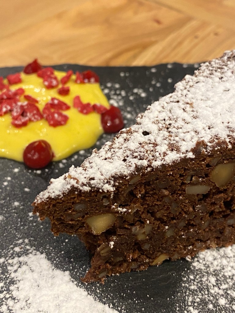 Caprese con cioccolato monorigine del Perù gran cru del distretto di Pachiza e mandorle di Toritto, con salsa alla vaniglia e gel di lamponi, finale che amplifica e stampa il ricordo di un incontro espressivo dall’inizio alla fine.