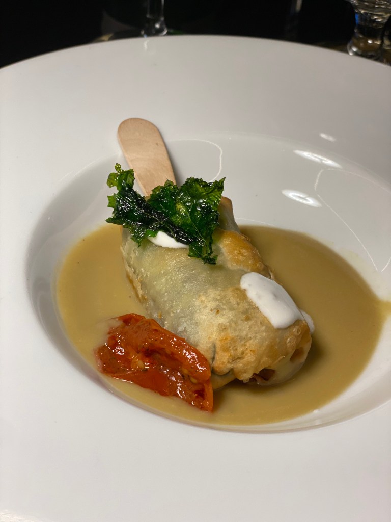 L’entrée trasforma l’eterna coppia partenopea (salsiccia e friarielli) in uno stecco immerso in crema di ceci. Divertissement.