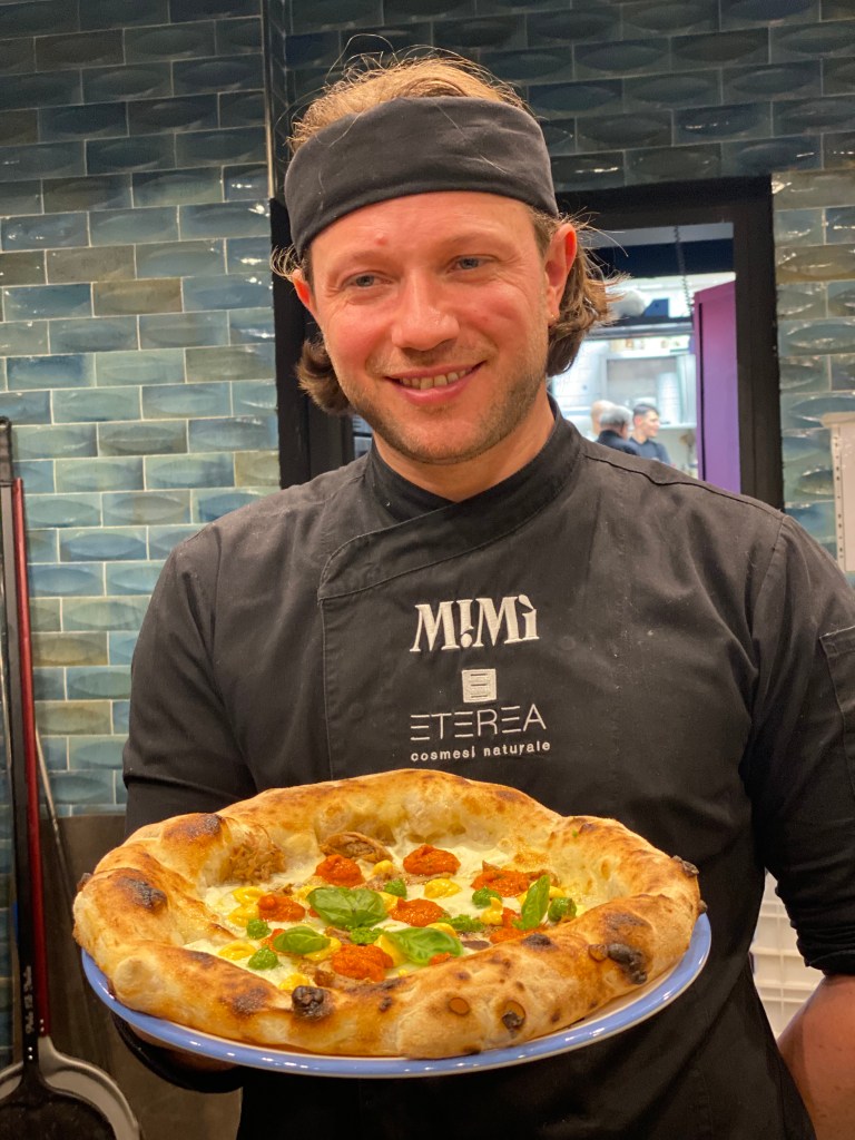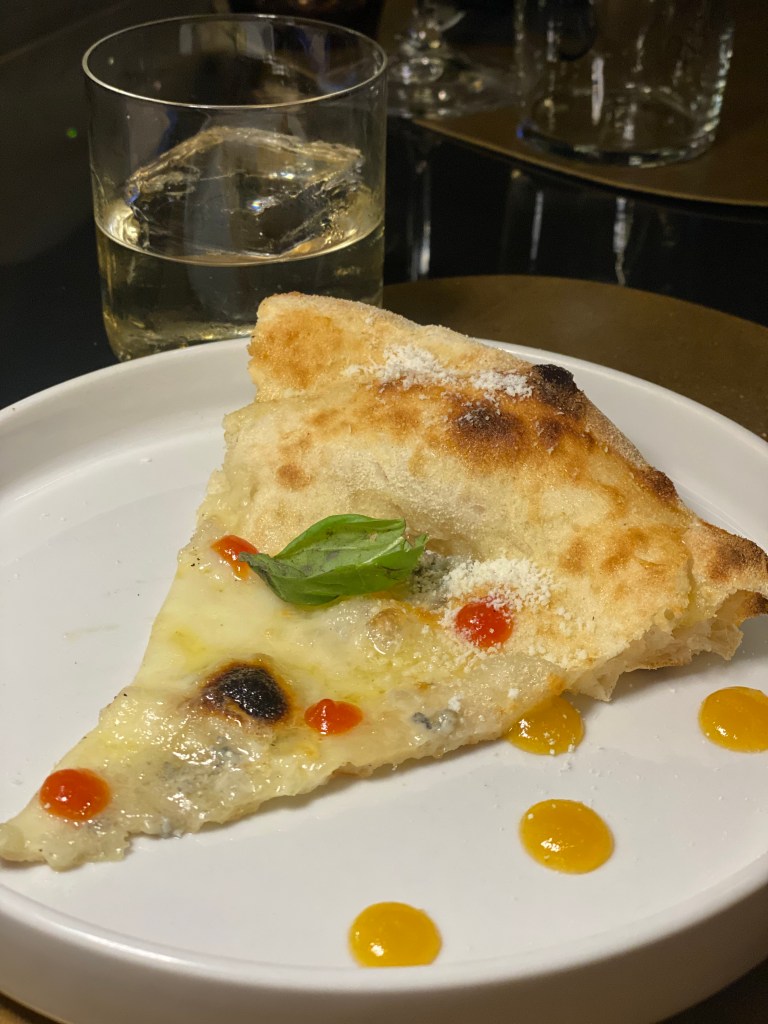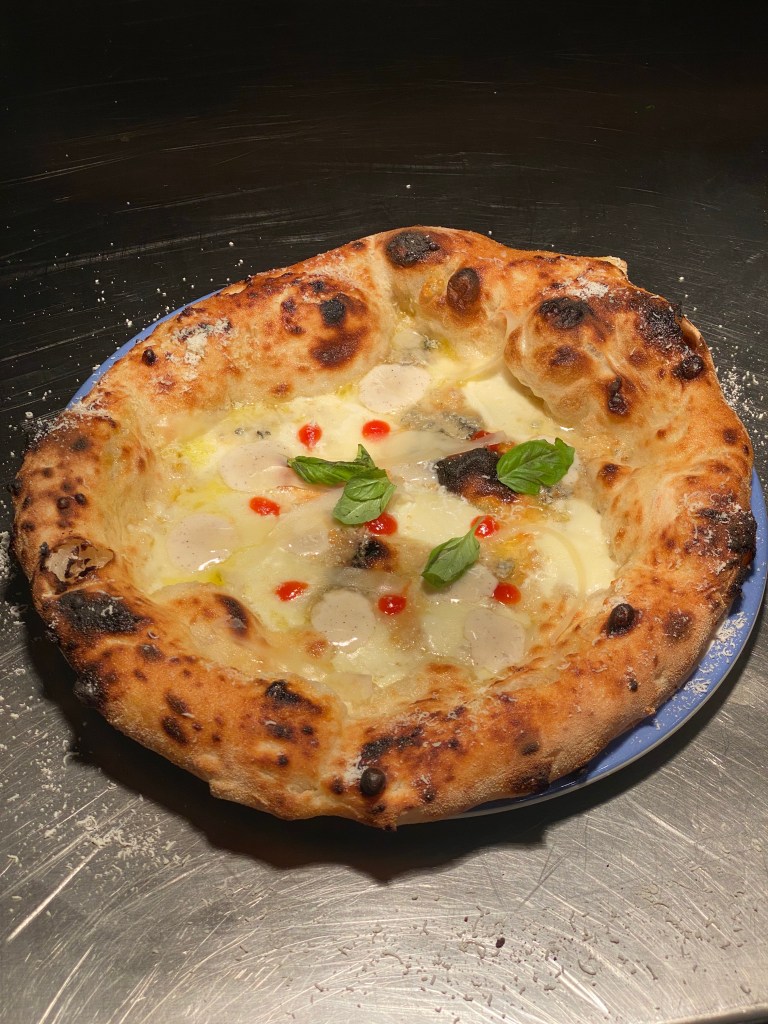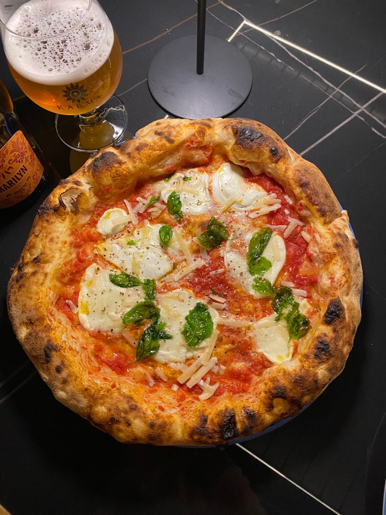 Carta d’identità, la Margherita Aversana vestita di bufala autoctona con lo zing dell’extradose di parmigiano. Cornicione generoso che implode al morso e trittico radioso.