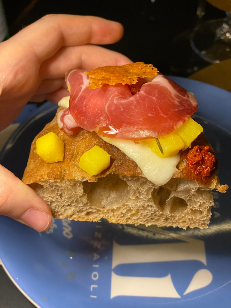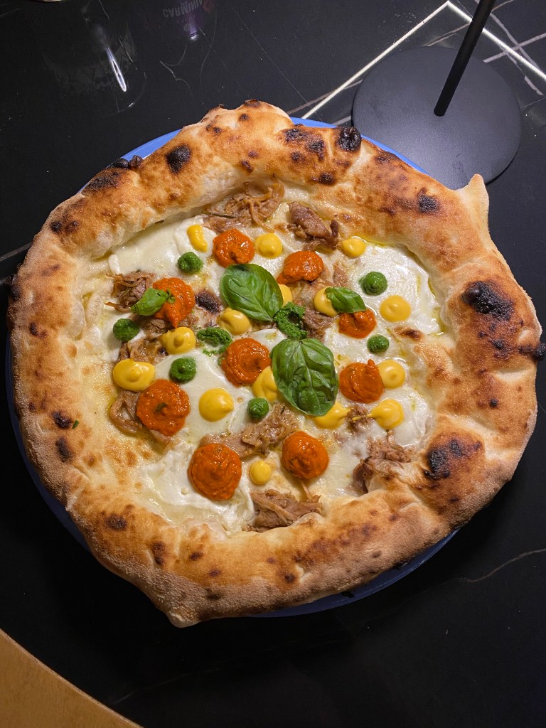 La Identità Napoletana racconta le intenzioni diverse. Come in un Manet. Tempera amara di rucola, aromatica di papaccelle e decisa/sapida di crema pasticcera salata. Il maialino cbt sguazza tra colori e sapori e aggiusta d’umami. Tecnicismi.