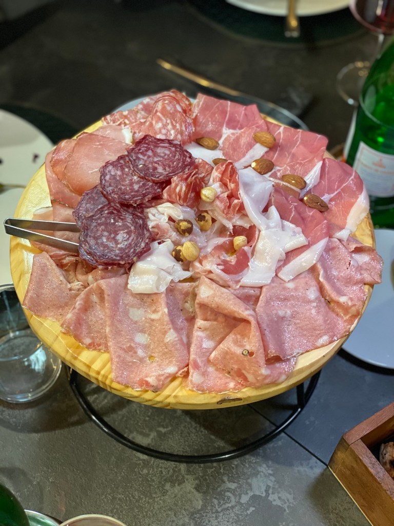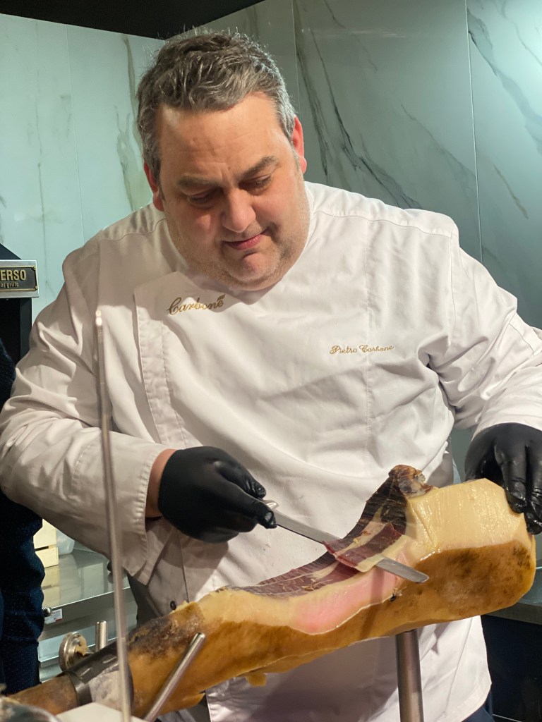 Incantato nel mirare Pietro adornare quel tagliare di eccellenze nostrane. Come la tavolozza di un pittore, l’amore per la materia che si eleva formosa e distinta, concetti, tempi di cottura e abbinamenti. Profumi, cromatismi, sapori autentici. Perdere la testa per la Finocchiona toscana fino ad arrivare al salame di cervo tipico delle zone alpine del trentino. E anche la focaccia di accompagnamento si fa mangiare…