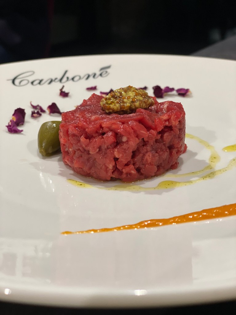 La Tartare Carboné è d’uopo. Umami e passione. Manzetta piemontese con salsa di nocciole, capperi fiore, pepe nero e senape di Digione. La materia che grida.