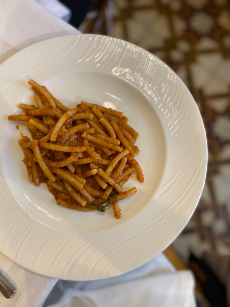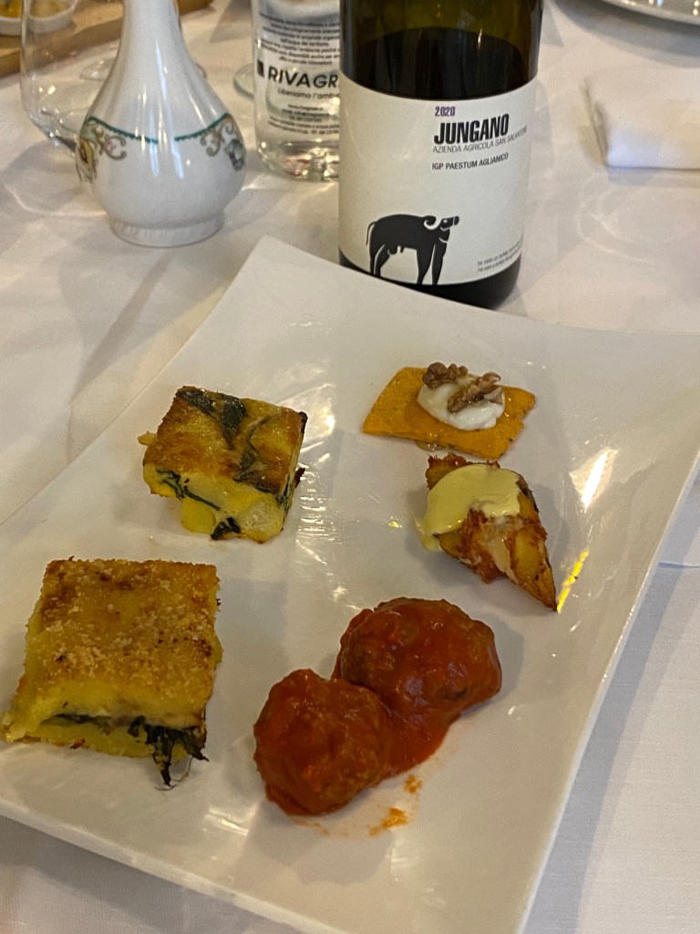L’antipasto è uno scioglilingua di divertissement da leggere tutto di un fiato: polpette al ragù con uvetta passa e pinoli; gateau salsiccia, friarielli e provola; sformato spinaci e patate; cracker pomodoro e origano con stracchino, noci e miele; polenta fritta, funghi e formaggio con fonduta di zafferano e pepe. Finisce subito.