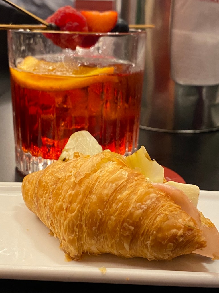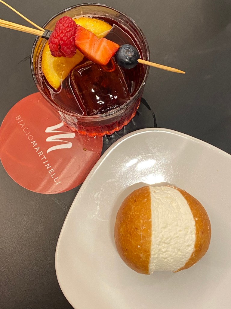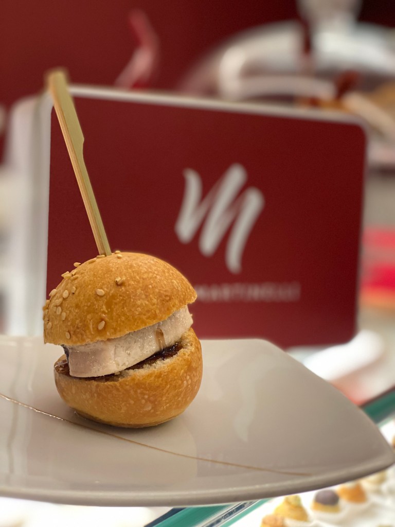 Anche l’aperitivo si fa diverso: croissant al conciato romano con mortadella e cremoso al carciofo, pizzetta sfogliata, tartelletta salata con ricotta di fuscella e noce tostata, macaron al sesamo bianco farcito con cremoso al parmigiano, bun con burger di tonno rosso, mayo alla cipolla di Montoro e glassa balsamica.