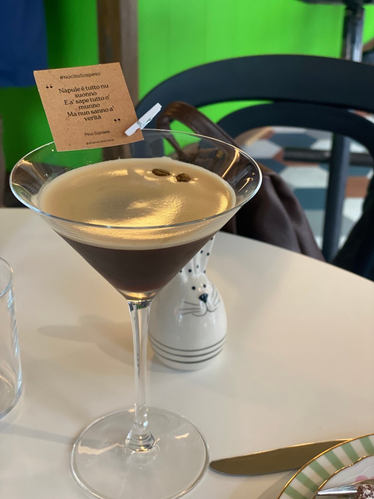 In abbinamento il Nocillo sospeso (Quintessenza Tortora, Nocillo Tortora, caffè espresso, sciroppo di zucchero, chicchi di caffè, oli essenziali di arancia). Pairing azzeccato.