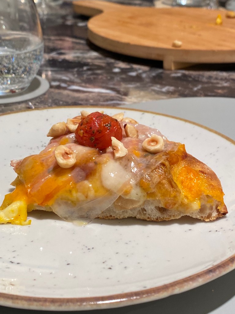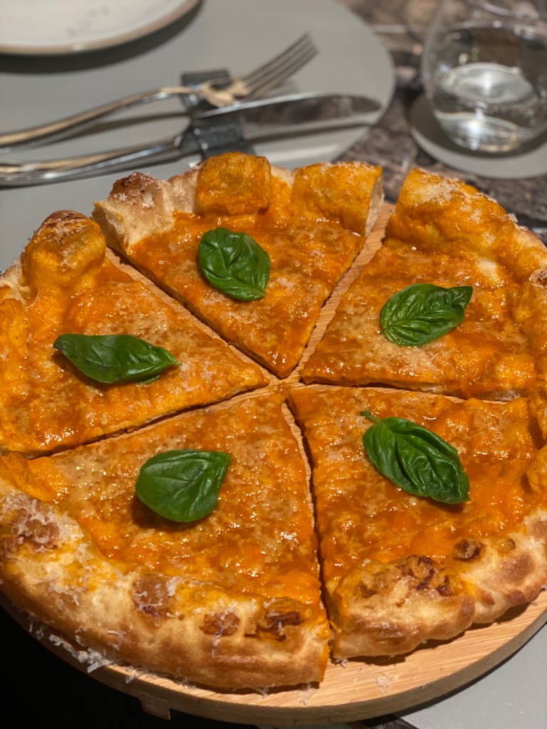 Ha l’educazione croccante della base crispy. Fragranza e texture, ennesima costruzione disegnata. Per la pala non vale il detto, altezza mezza bellezza. Qui il Sentiero nel Bosco è perseguibile senza sforzi mandibolari. Zucca, porcini e pancetta scrivono l’opulenza. Consistenze avvolgenti.