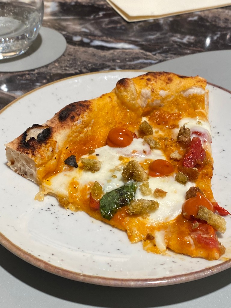 Ha i colori della prima tonda, l’estetica utile mai arrogante. La Regina del Vesuvio vive su impasto partenopeo e parte contemporaneo. Tenace al morso e sublime di forma. Tutte le tinte del pomodoro: Piennolo, datterino arrosto, ridotto e poi bruciato, e un crumble aromatizzato detta le pause tra acidità e tendenza dolce. Concentrazione e modernizzazione.