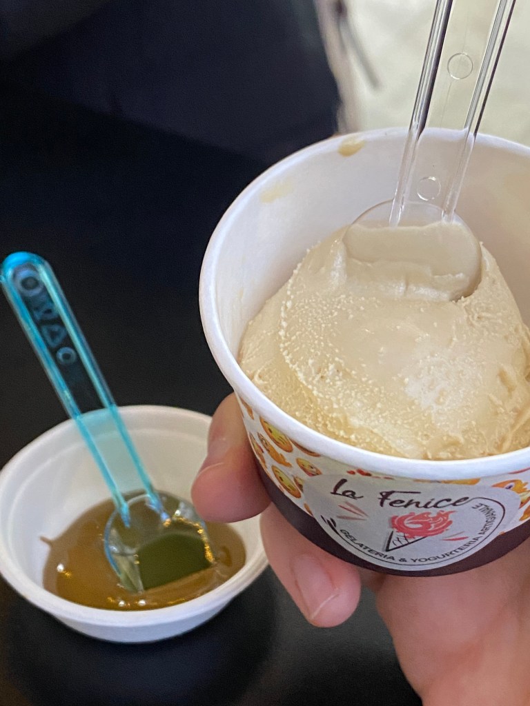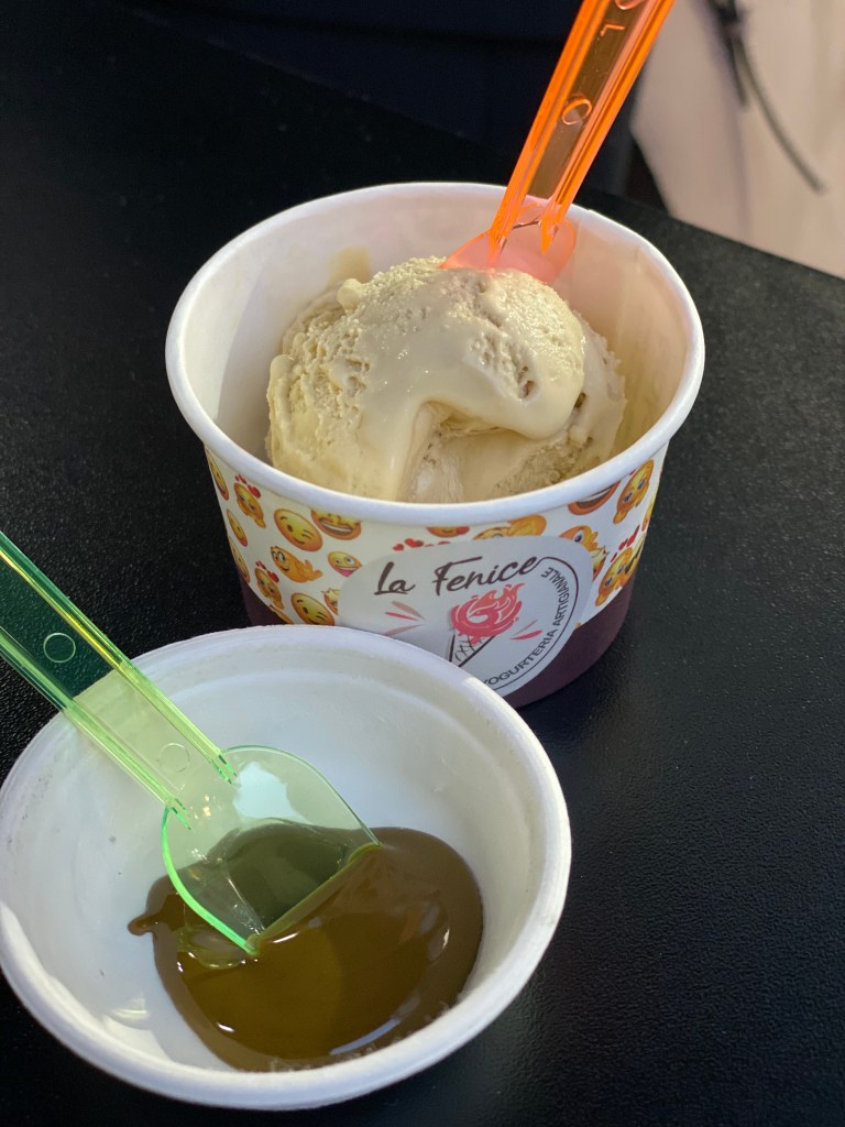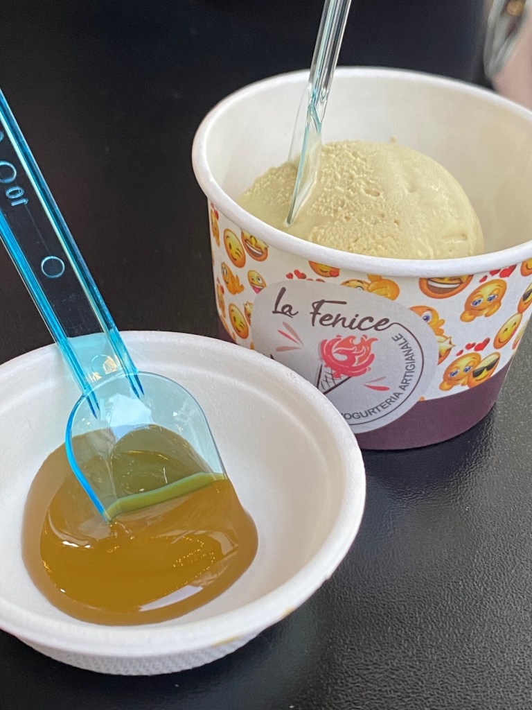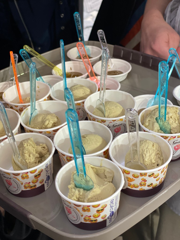Beh il gelato, quello autentico, è di colore marroncino. È la prima cosa che sorprende durante questa orizzontale di gelati (e delle relative paste) denominata “FeNice di conoscerlo”, con 4 tipi di pistacchio provenienti da varie zone del pianeta: Iran, zona in cui muovi i primi passi il pistacchio presente già nella preistoria, Grecia, Spagna, oggi la sua nuova residenza, e Italia, che in Sicilia, Bronte certo, ha la sua produzione di eccellenza.
