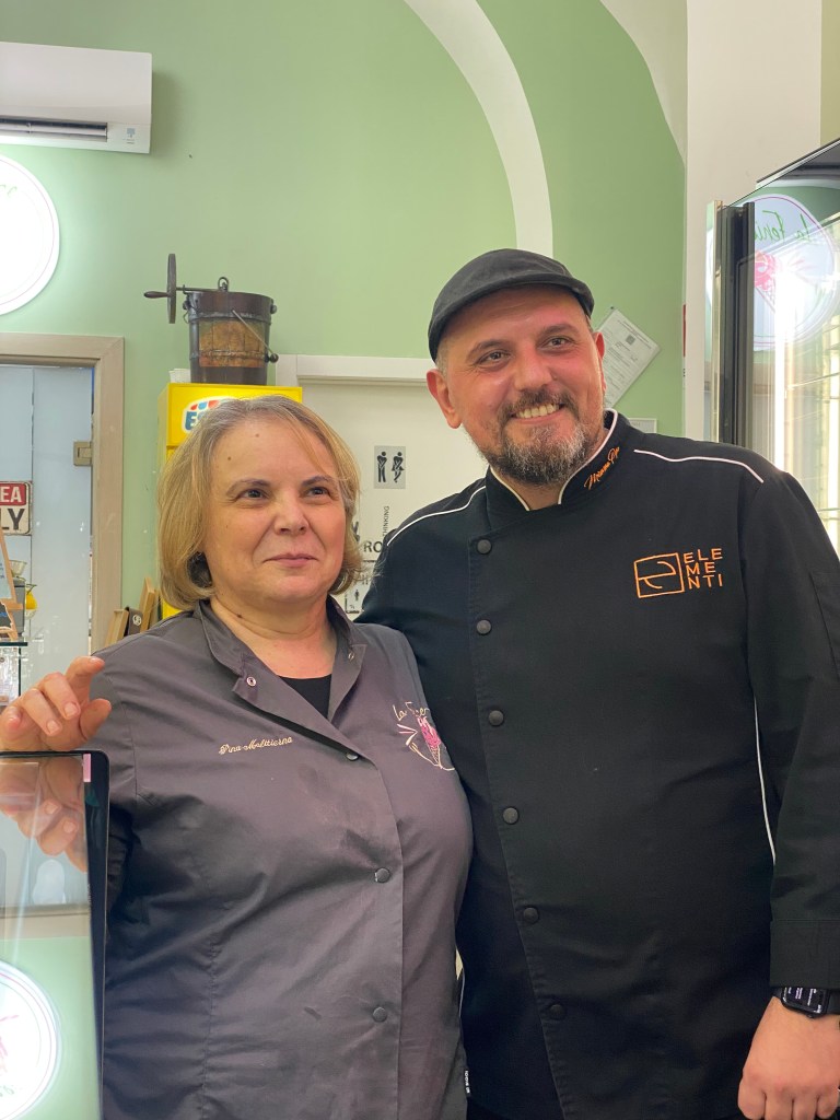 La materia innanzitutto per la Elsa aversana, pochi zuccheri e l’ingrediente al centro della creazione. Le sue creature scivolano in bocca come se fossero latte, né oleosi, né liquidi, e si sciolgono così i nostri animi.