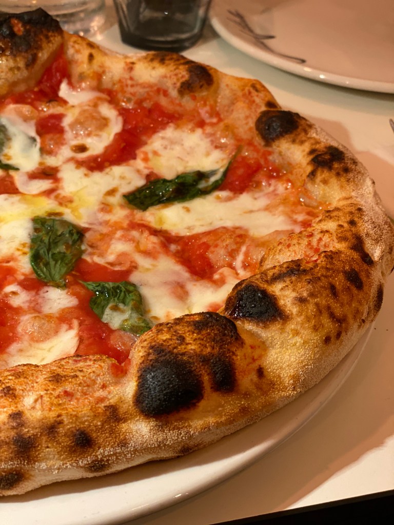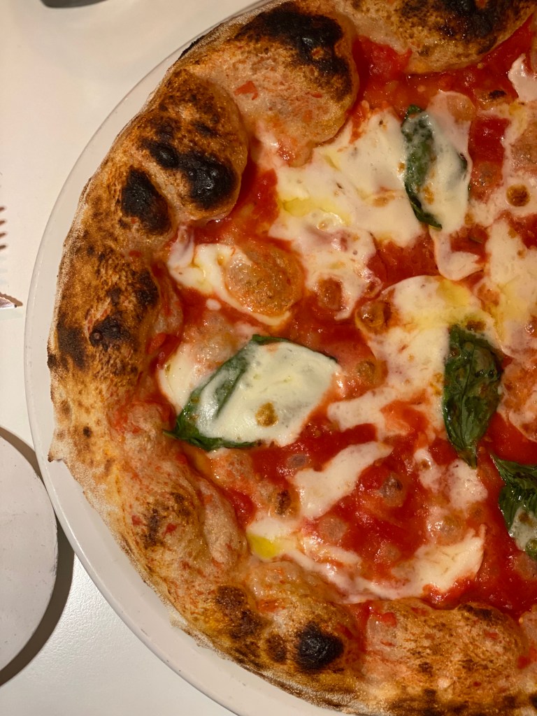 Lo dico subito. Teorema: il fiordilatte baciato dalla Bufala (20%) è una costante. E la Margherita qui è soave. I sensi sono grati per la sua sottile delicatezza. Una visione quasi angelica di una composizione precisa per cottura e texture della trama. Il latticino si vede e si sente “che è baciato”: fila a dismisura, diventa quasi un velo e in alcuni punti caramellizza. Tendenza dolce anche del San Marzano schiacciato a mano, denso, profondo e non stracotto, su cui passeggia l’aromaticità dell’olio evo Frantoio Romano. Cornicione visibile ma non eccessivo. Un bel mordente vivido dall’inizio alla fine e un “cuore di burro”. Un po’ crunch, un po’ soft. Modernità eterna.