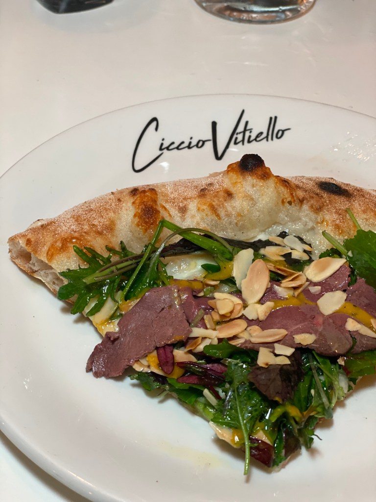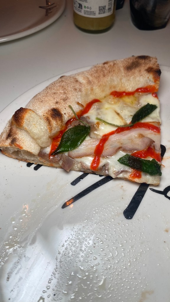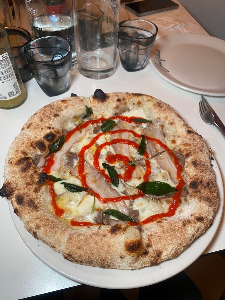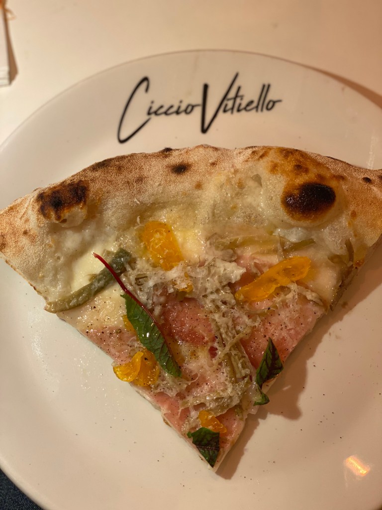 Poi la Maiale mangiacarciofi. Bella, profumosa. La materia trova le carezze di chi li esalta. I carciofi cotti a freddo proposti a listarelle sono gradienti di giuochi e sapore. Zero liquidi o componente acetica. La lonzarda di nero casertano amalgama, “grassa” e allunga virando sulla tendenza dolce. Il pecorino a pioggia aggiusta di sale. L’ovetto è l’umami terroso che detta le pause. L’impasto è l’ultimo ingrediente, con la sua cottura impeccabile. La tela giusta per queste nuance bucoliche. Da mangiare tutta!