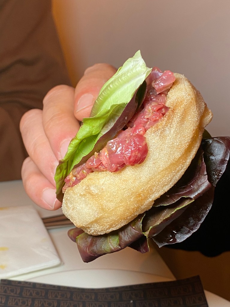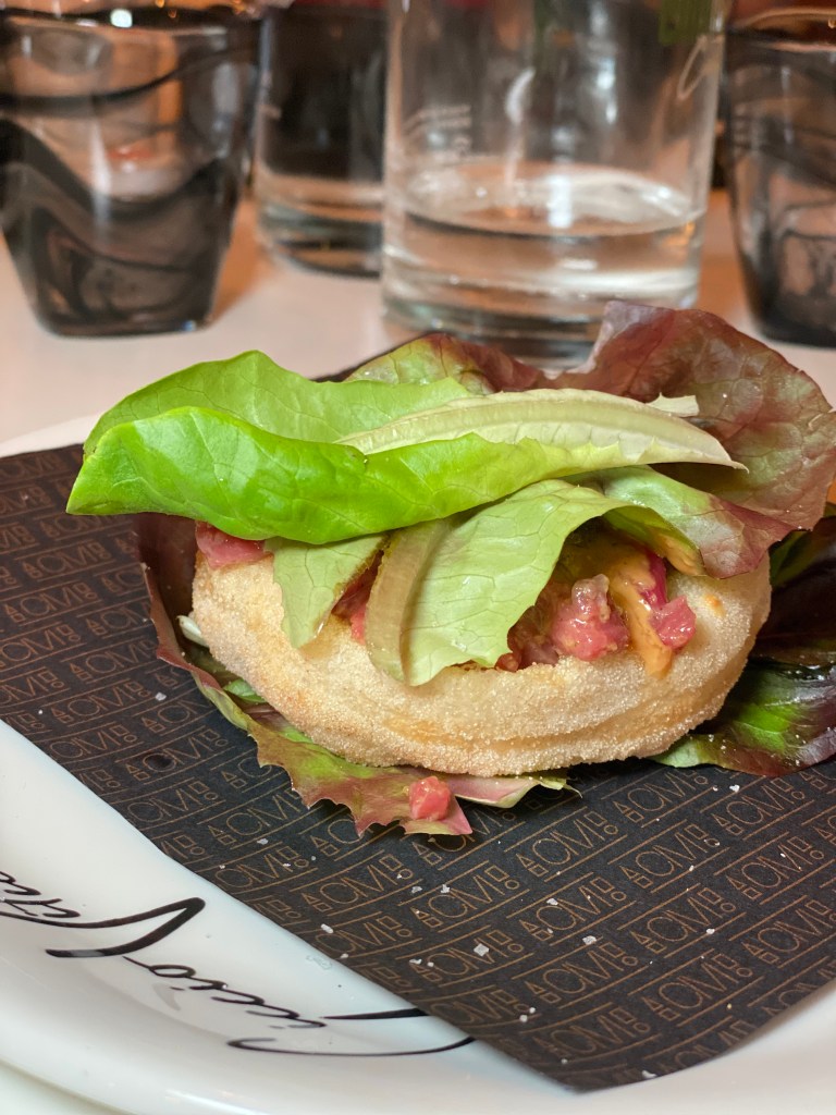 Poi gli incontri stratificati… Un disco fritto e dorato che cruncha e sconvolge per delicatezza. Un cuore ammaliante che swithca l’approccio e dà quella dipendenza da morso successivo. Arriva la battuta di marchigiana. Fusion ante litteram con senape e cetriolini. Solleticare il palato con effetti speciali. Tappeto di umami, col pungente e speziato stechiometrici. Un girotondo continuo dall’inizio alla fine. Poi cremosità che arrotonda, smussa, burro d’arachidi con la sua intensa riccanza. Cipolla marinata in aceto e lampone, l’entasi dell’aromaticità che spinge l’olfatto nella dimensione agrodolce. Infine, lo zing dell’alice di Cetara che aggiusta di sale ed enfatizza.