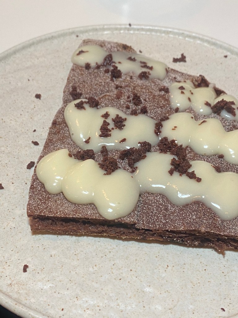 Un parallelepipedo che sembra uscito dalla vetrina di un gioielliere. Come una fetta di pane che si riscopre dolce, aromatica. Un crunch che sai di agrumi, di candito, immerso nell’amaro suadente del fondente con nuance di caffè, cremosità di limone e allegria di crumble di nocciole. Qui la pizzeria scompare. Valore aggiunto.