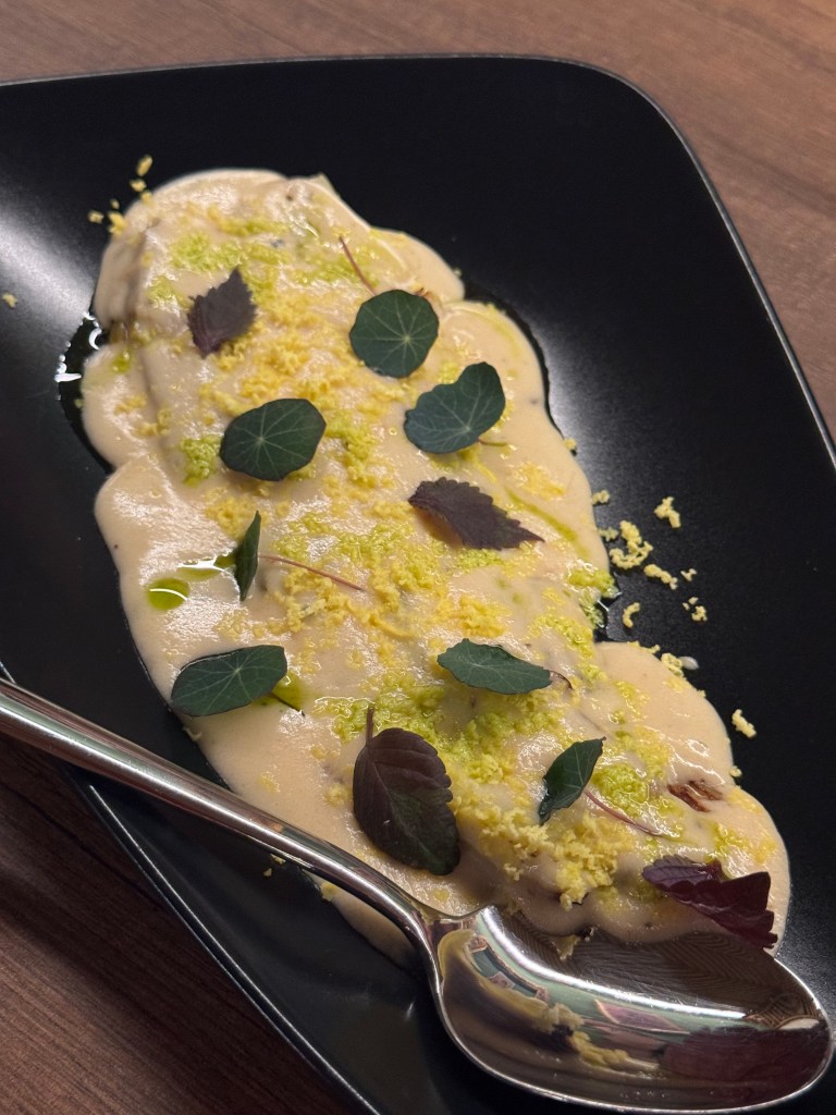 Porro arrostito alla brace, crema tostata con lime e pepe nero, olio alle erbe e tuorlo duro grattugiato. Intensità progressiva e variegata, con derive cremose deliranti e crunch fumè delicato. Comfort good.